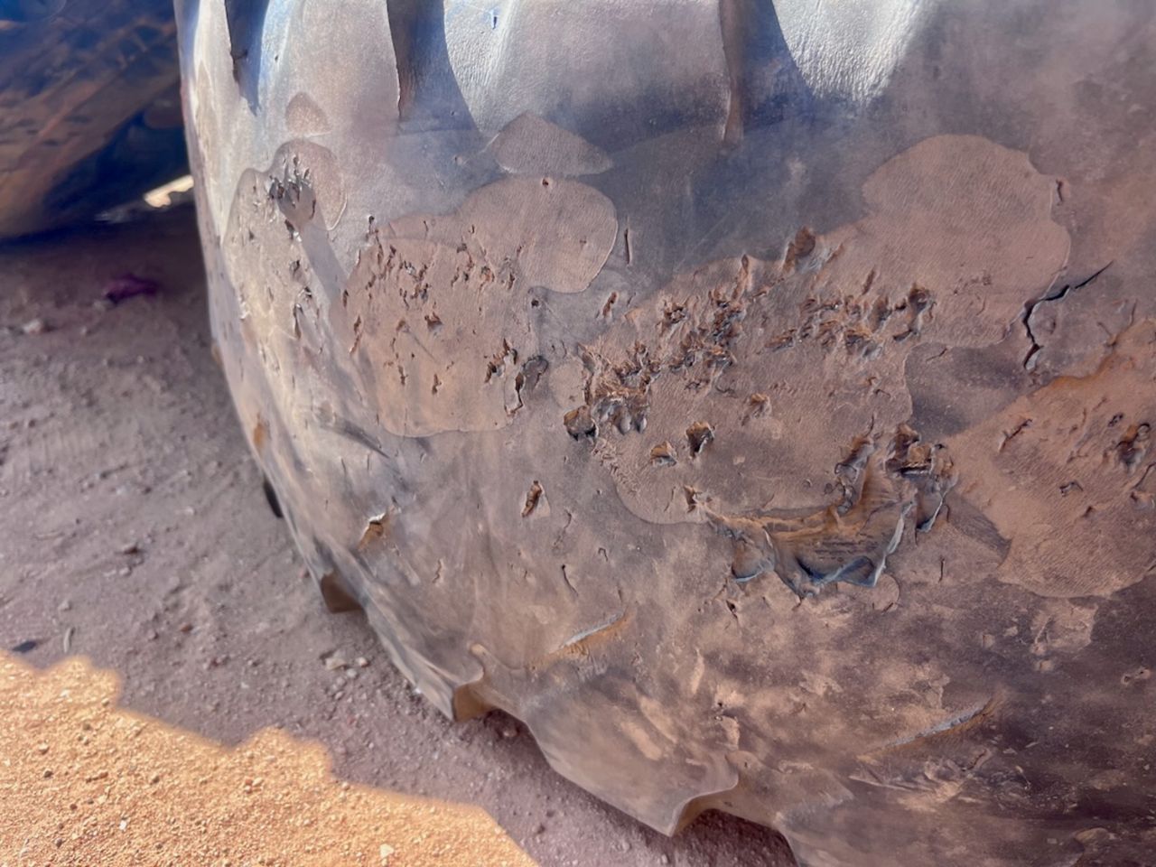 Deux Ă l'avant en mode chaussettes trouĂ©es, boulochage XL. Taille d'origine rarissime, 335 pour les mordus de la gomme, câest la pointure de lâarmĂ©e et des dinosaures. En 2019, trois semaines dâattente rien quâen France. Ă Abu Dhabi, nous avions eu la chance de refaire le plein en trouvant le stockage de Michelin de tout le Moyen Orient. Ici, en Afrique, on fait dans la foi et le bus local.
