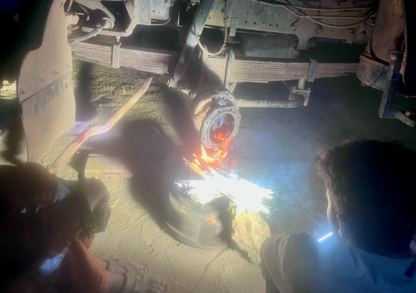 La démerde africaine est bien là : poste à souder maison, branchement électrique en mode far-west, feu de camp sous les éléments récalcitrants, nous sommes en confiance ! Tout y passe pendant 2 jours à démonter, essayer, redémonter, relaver, réessayer. Miracle : ça semble à nouveau fonctionner. Le maßtre-cylindre et moi sommes réconciliés devant un bon rhum coca.