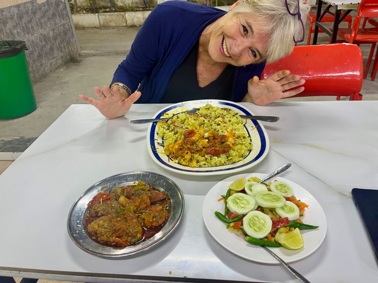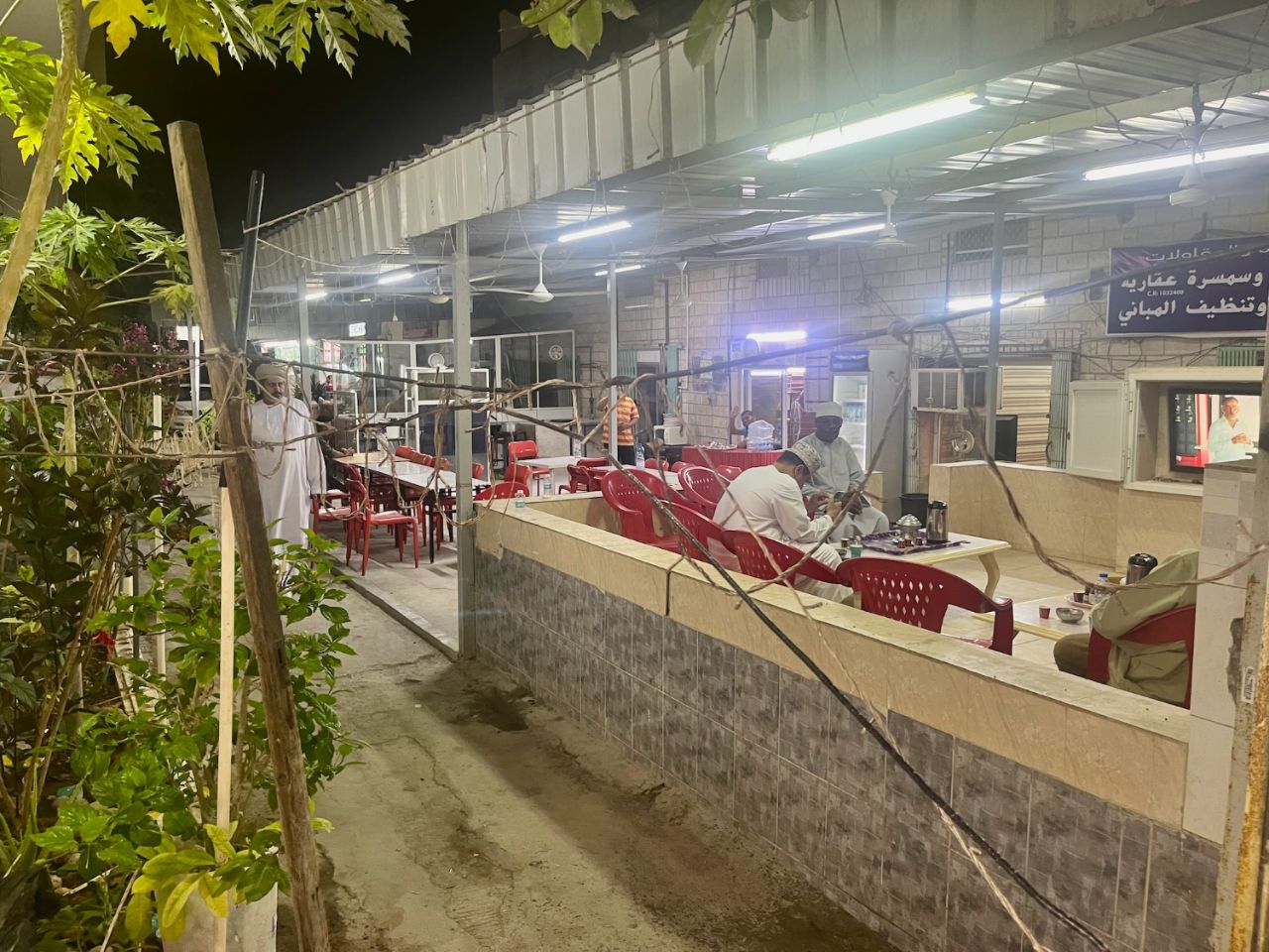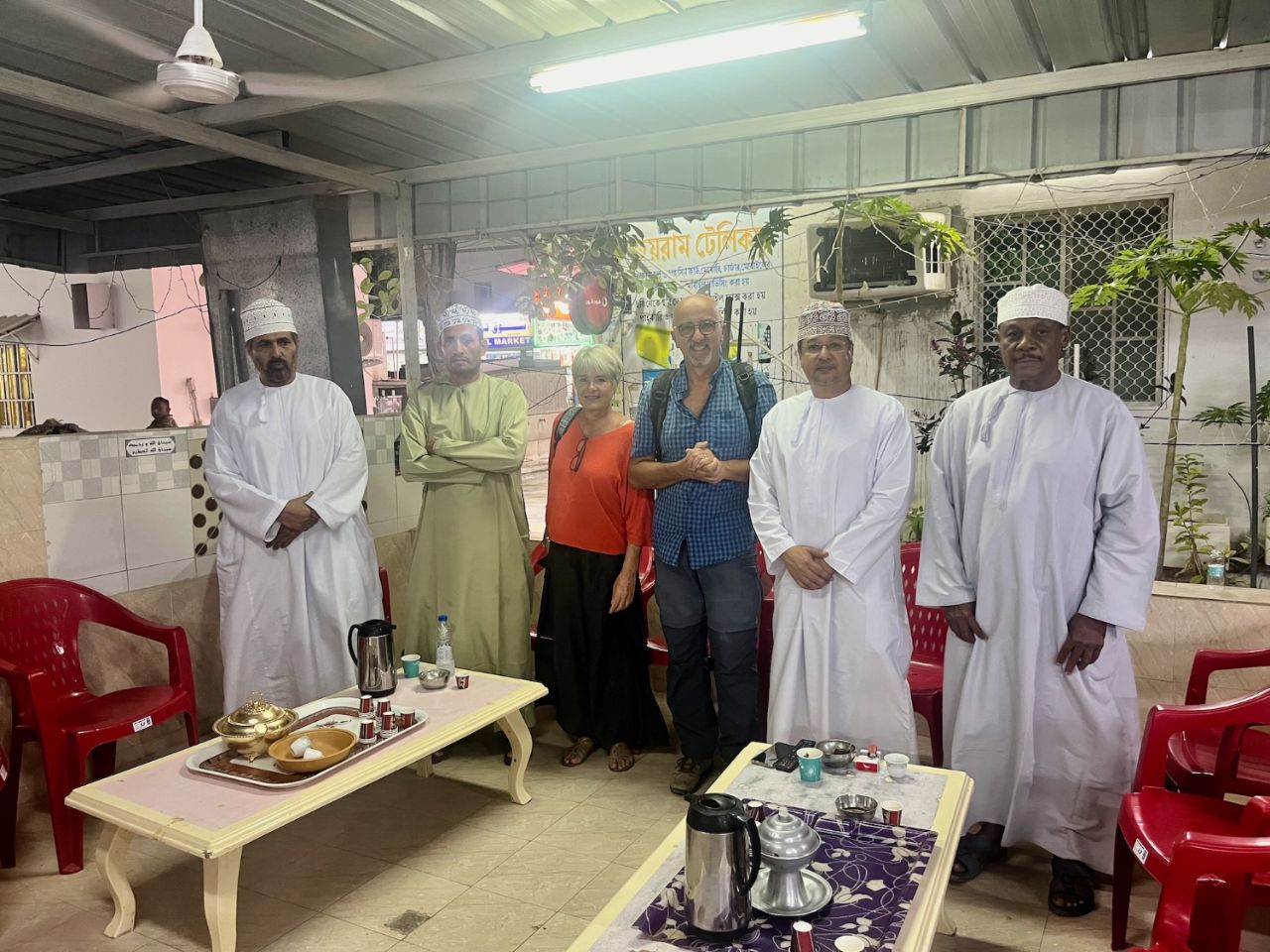Here we are, naked without you... A few days waiting in a small hotel and we find our little local bistro in old Salalah (17.01292, 54.0971). It quickly became our daily canteen. A typical Omani community space adjoins it. This is where they meet in the evenings for potlucks, with everyone bringing a snack. They spent their childhood in this neighbourhood, then built a house better suited to modern life. The old houses in this neighbourhood have been converted into small shops on the ground floor and the rooms into apartments for rent to the middle class or workers in the local shops. Thank you for your welcome, dear Omanis!