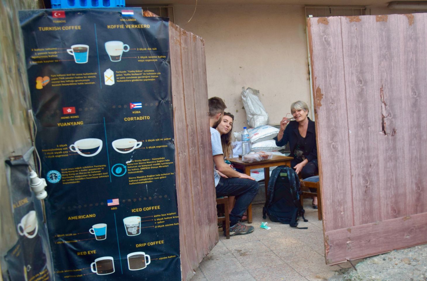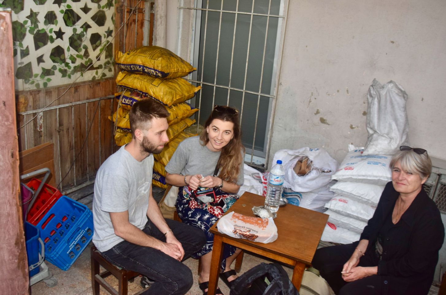 Assoiffés en pleine après-midi, en plein ramadan, nous avons fini par trouver un endroit ou prendre un thé. Voyant la présence de deux femmes (Muriel et Clara), il nous a gentiment installé dans le local réserve et poubelle... La religion c’est déjà con, mais alors la façon de l’interpréter c’est wouaouh débile !