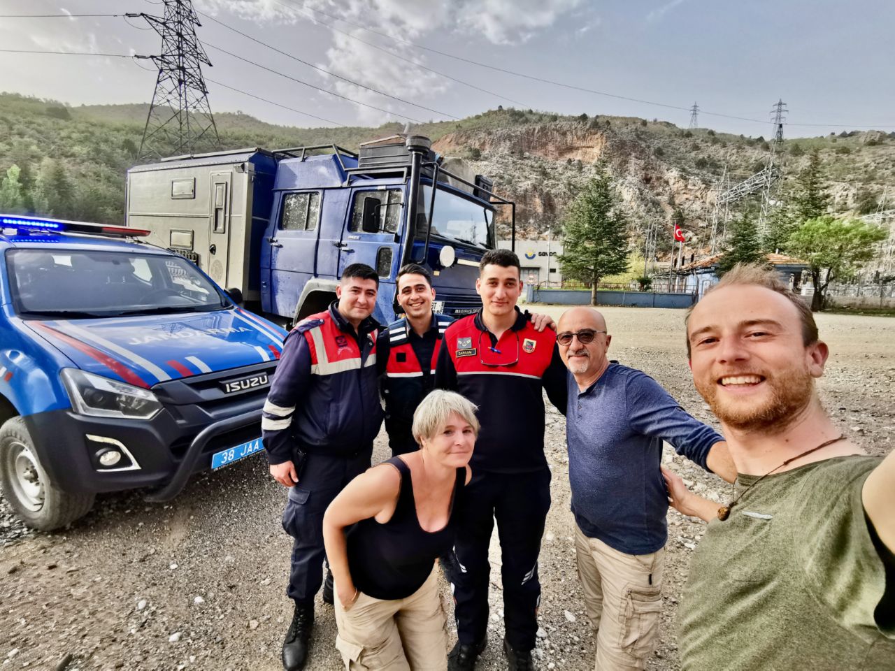 Ils nous aurons montré le bon chemin et escorté sur 30 bornes, soit une bonne heure (va pas vite quand ça tourne, monte ou descend le Cargol…) Le bivouac est cool, allez çay à l’arrivée avec la Jandarma ! 😉
