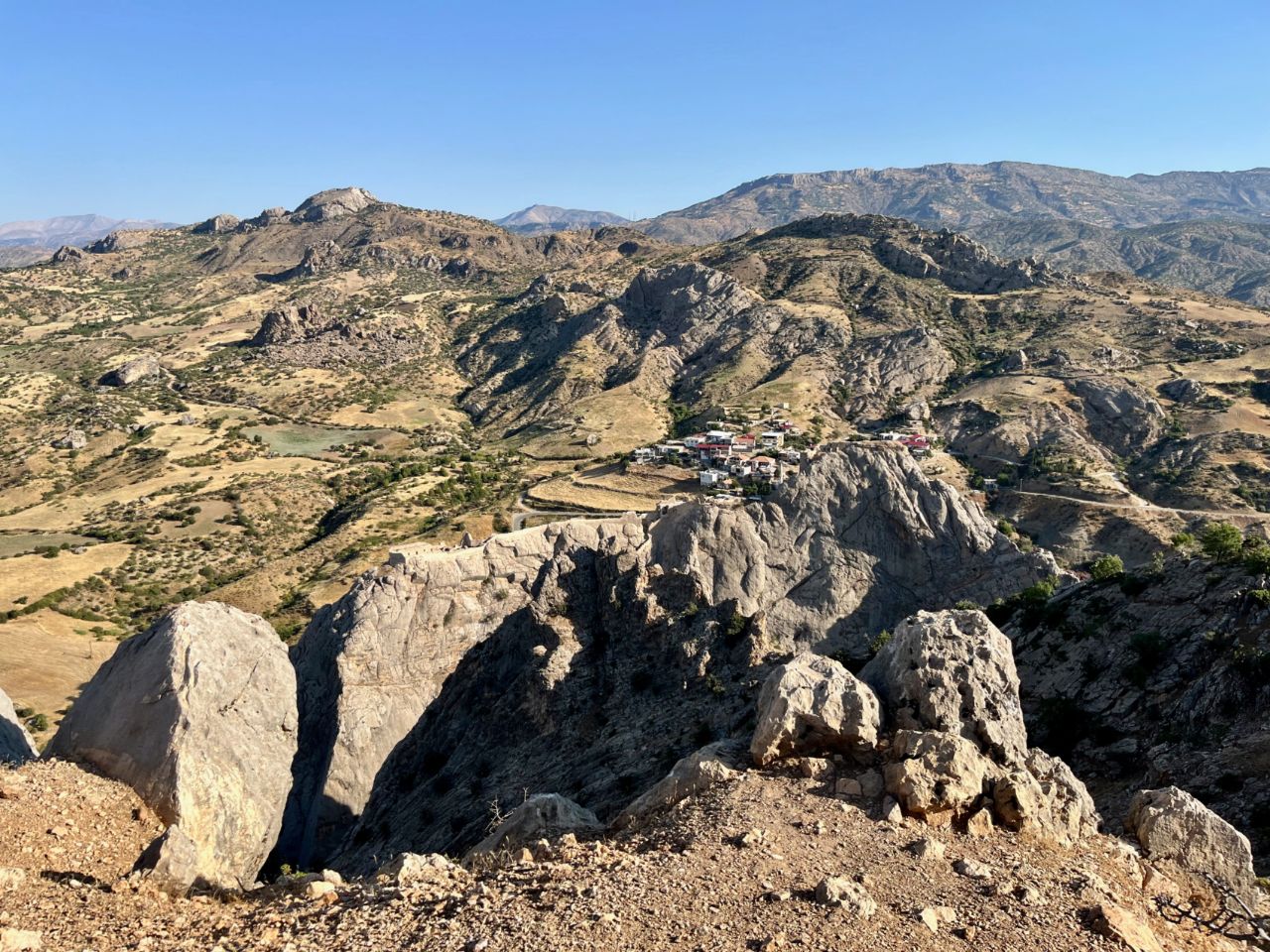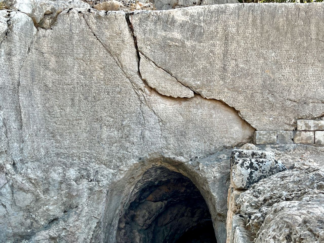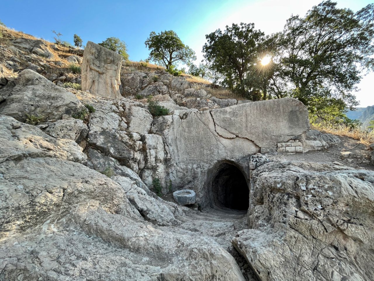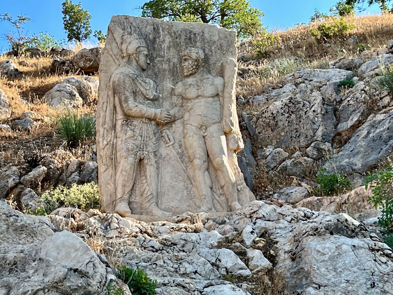 En 5 mn à pied, tu accèdes en haut d’une petite colline qui domine toute la vallée et l’ancien château de Kocahisar. Et à tes pieds pleins de cailloux que tu comprends vite qu’il s’est passé quelque chose dans l’ancien temps par ici. Et sur ce chemin que tu prends pour arriver en haut, une stelle étonnante représentant Antiochos serrant la main d’un dieu (quand je vous parlais d’égo…) et un Tunnel… des inscriptions… Tunnel descendant très fort et qui serait bouché beaucoup plus bas. Etonnant !