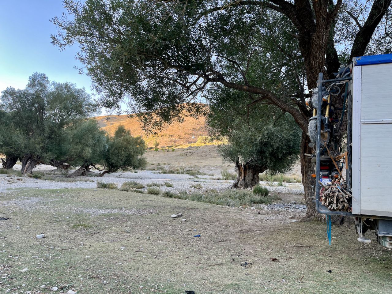 Ce sont des bergers qui d'ailleurs nous ont amené à cet endroit idyllique. Bord de rivière, à l'ombre d'oliviers énormes multi-centenaires, du bois pour du feu et des bergers aux alentours aux petits soins...