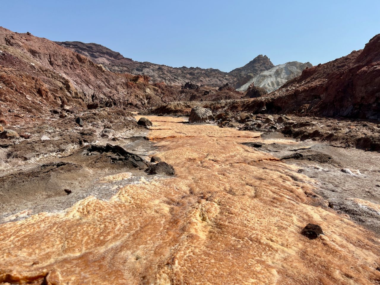 The small mountains do not look like any other. It goes from white to red ochre, to green, to canary yellow... wow... oh a dry orange river here. You're hallucinating!