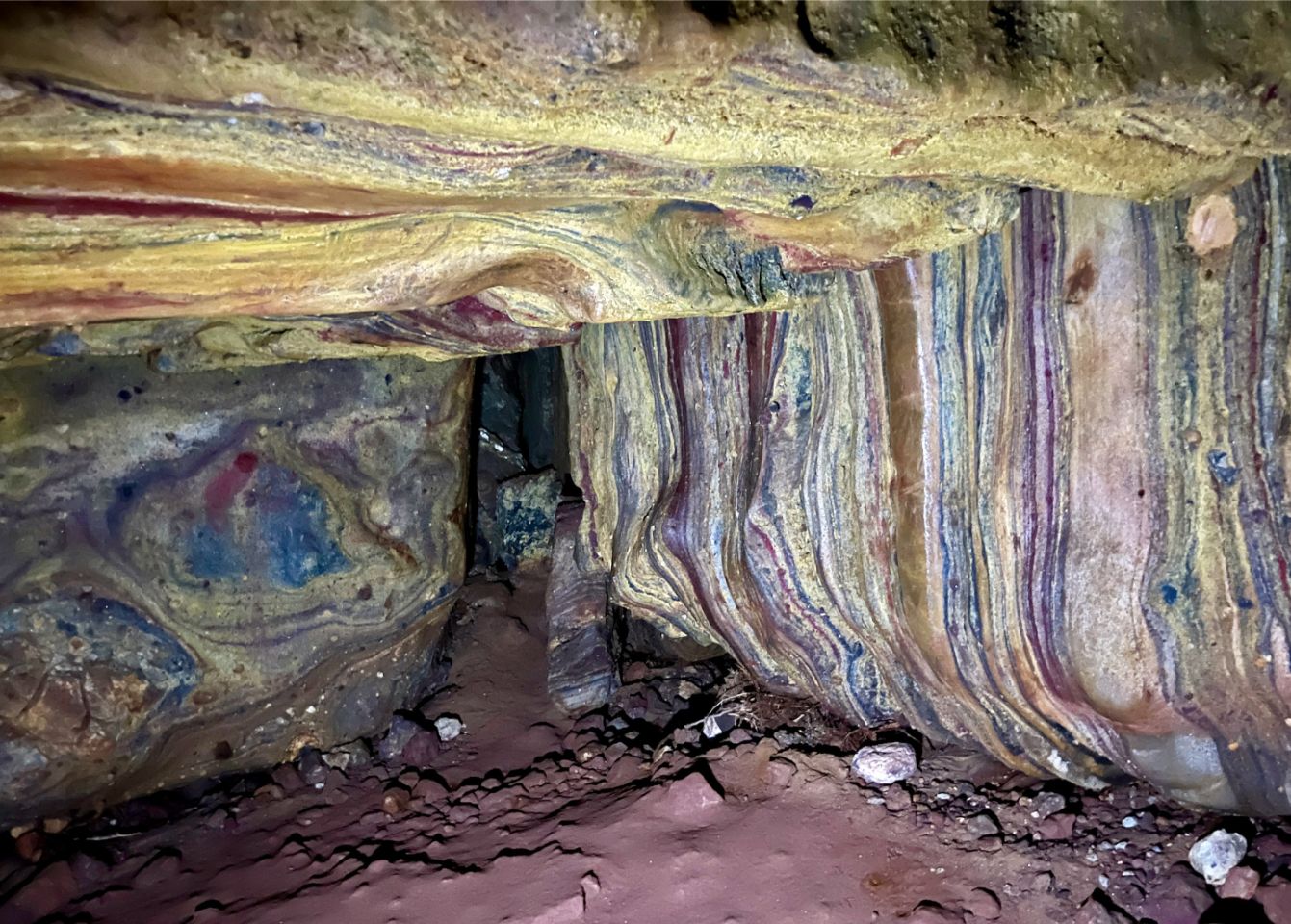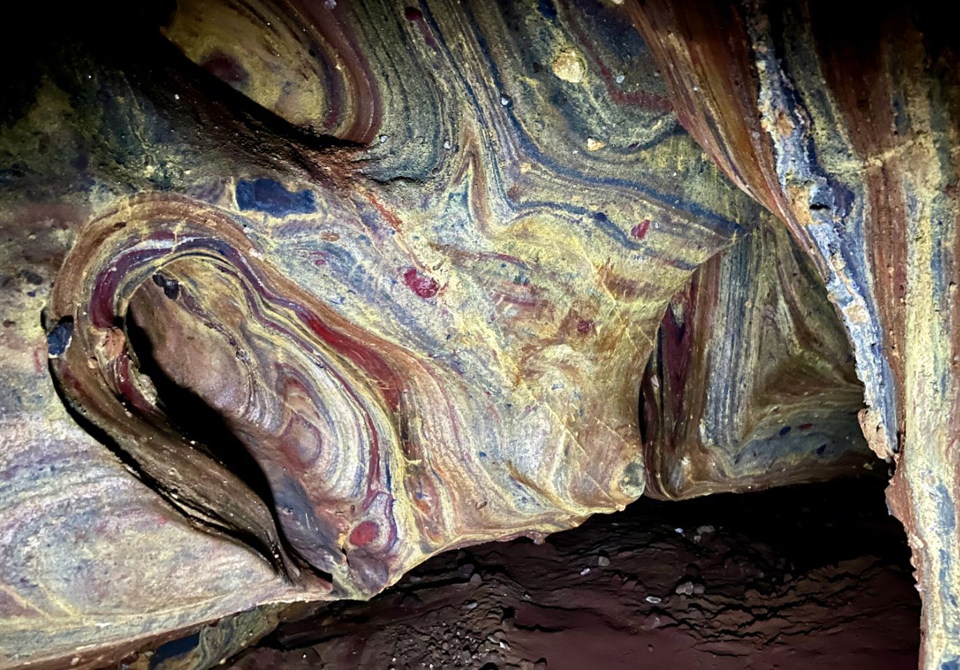 Et le clou : une grotte découverte voilà 5 ans dans laquelle tu pénètres seul avec ta lampe. Après un cheminement plutôt claustrophobique, la salle s'élargit, ta lampe éclaire à gauche, à droite revient à gauche, au milieu... yeux écarquillés. Un mille feuille de roches plissés et colorés, la 8ème merveille du monde. Là tu es au firmament de la magie terrienne ! 😳 😍 🤪