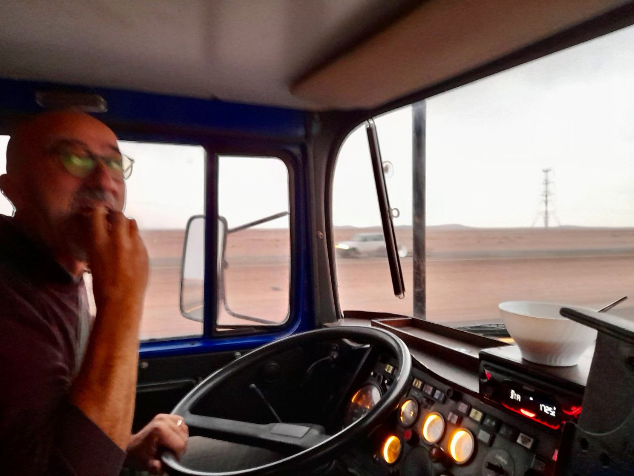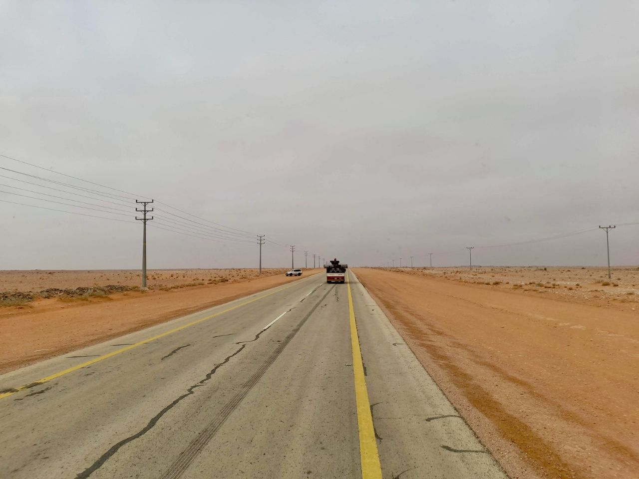 There is nothing exciting about this part of northern Saudi Arabia. Endless straight lines in a mostly flat environment, left or right, stony sand, micro bushes and rubbish. You can even drink your tea and dip your cupcakes while driving because you're in a hurry to get there.