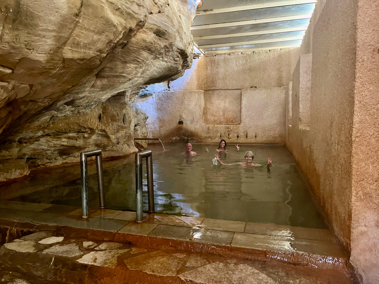 Fond d'une vallée hyper encaissée, au bout du bout d'une petite route. Des bassins pour les hommes en extérieur. Il est tôt le matin, il n'y a personne. Nous sommes autorisés à aller tous ensemble dans le bassin des femmes, quasiment en intérieur, utilisant la paroi rocheuse sur l'un de ses côtés.