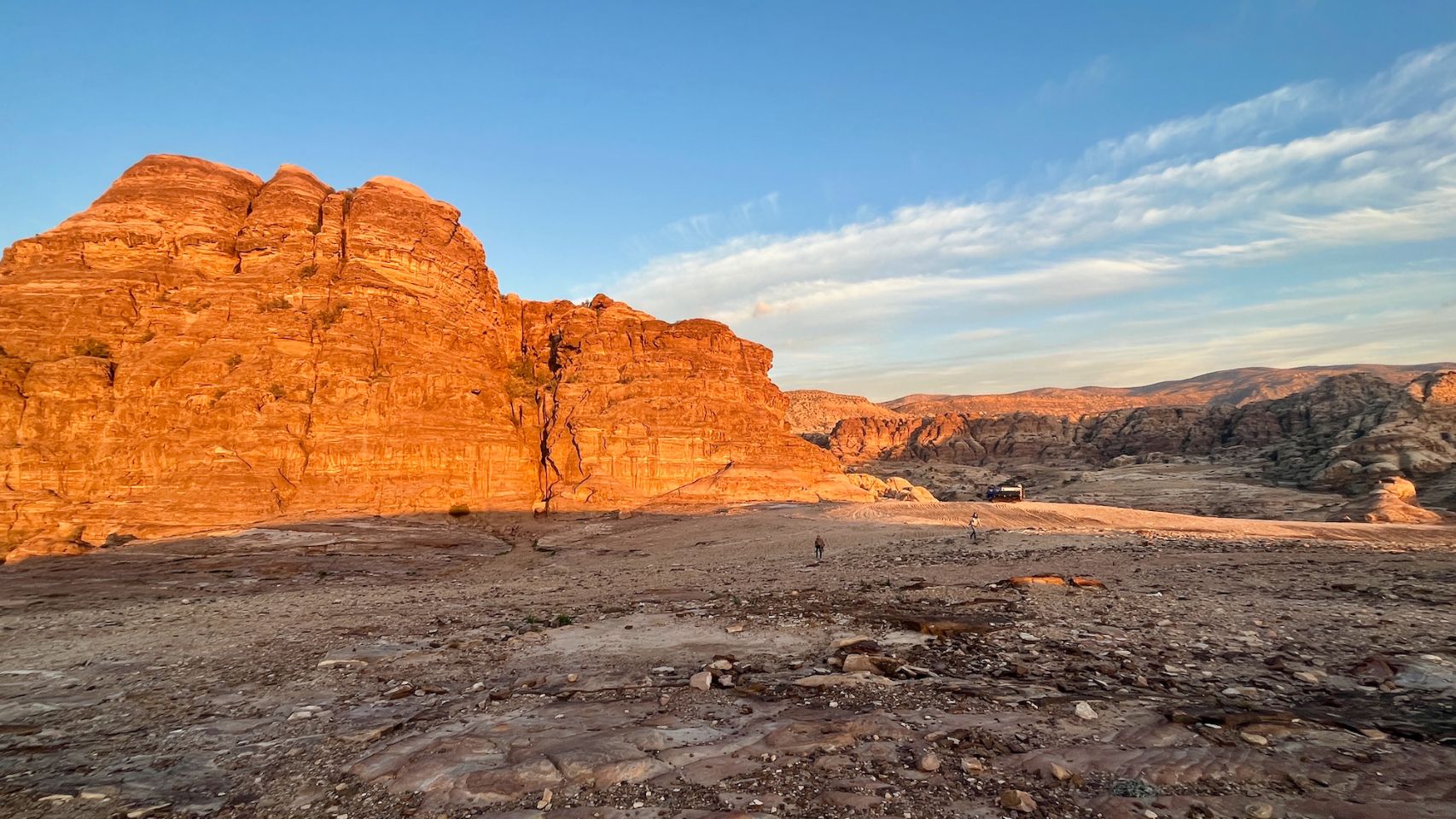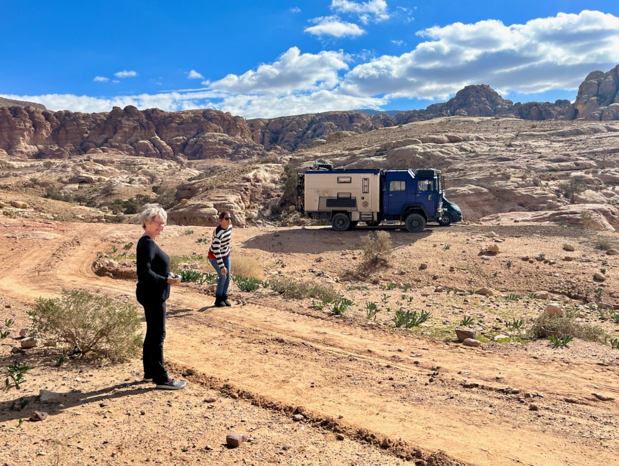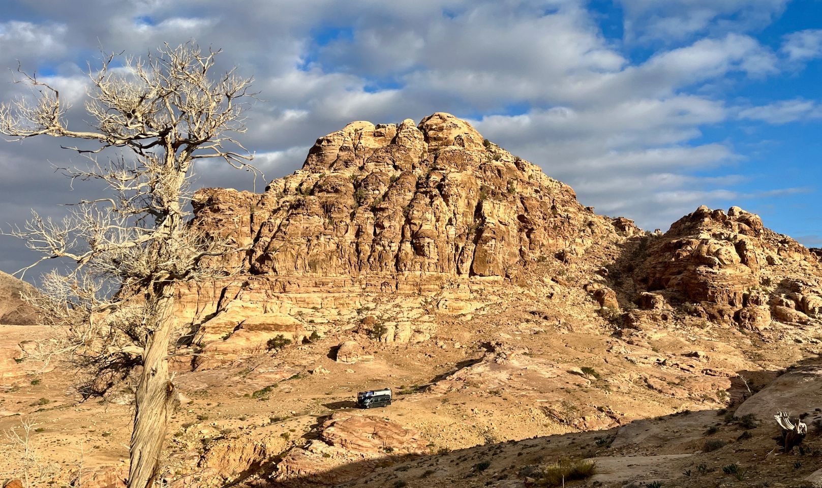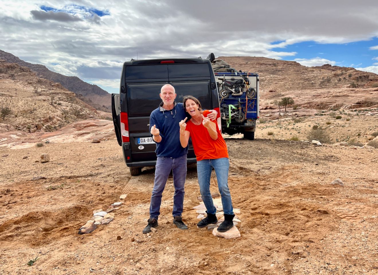 The one that allows us to leave from -400m and arrive directly on Little Petra is a pearl. Well negotiated, it's a superb bivouac with a petanque field as a bonus. The only place a bit soft, the Fiat Ducato had to get into it, an opportunity for Cargol to take on the role of breakdownman... 1, 2, 3, go ahead and pull, big guy!