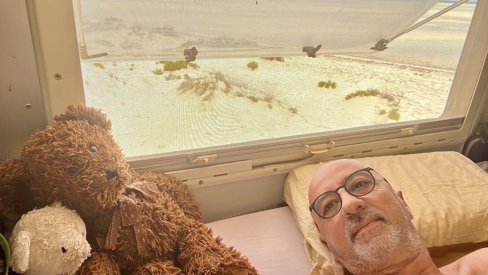 When you've just crossed Arabia, it feels good to take a dip in the water. Unfortunately, my sloe is stuck on my back, I've been lying there for 48 hours, it's more than very hot, the windows are open and there's a sea breeze, opium and anti-inflammatories, the nonos are there to keep me company, everything's fine!