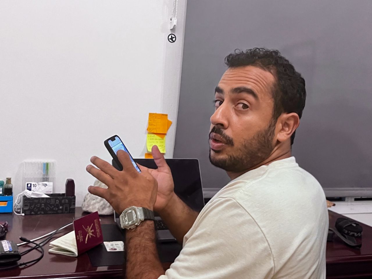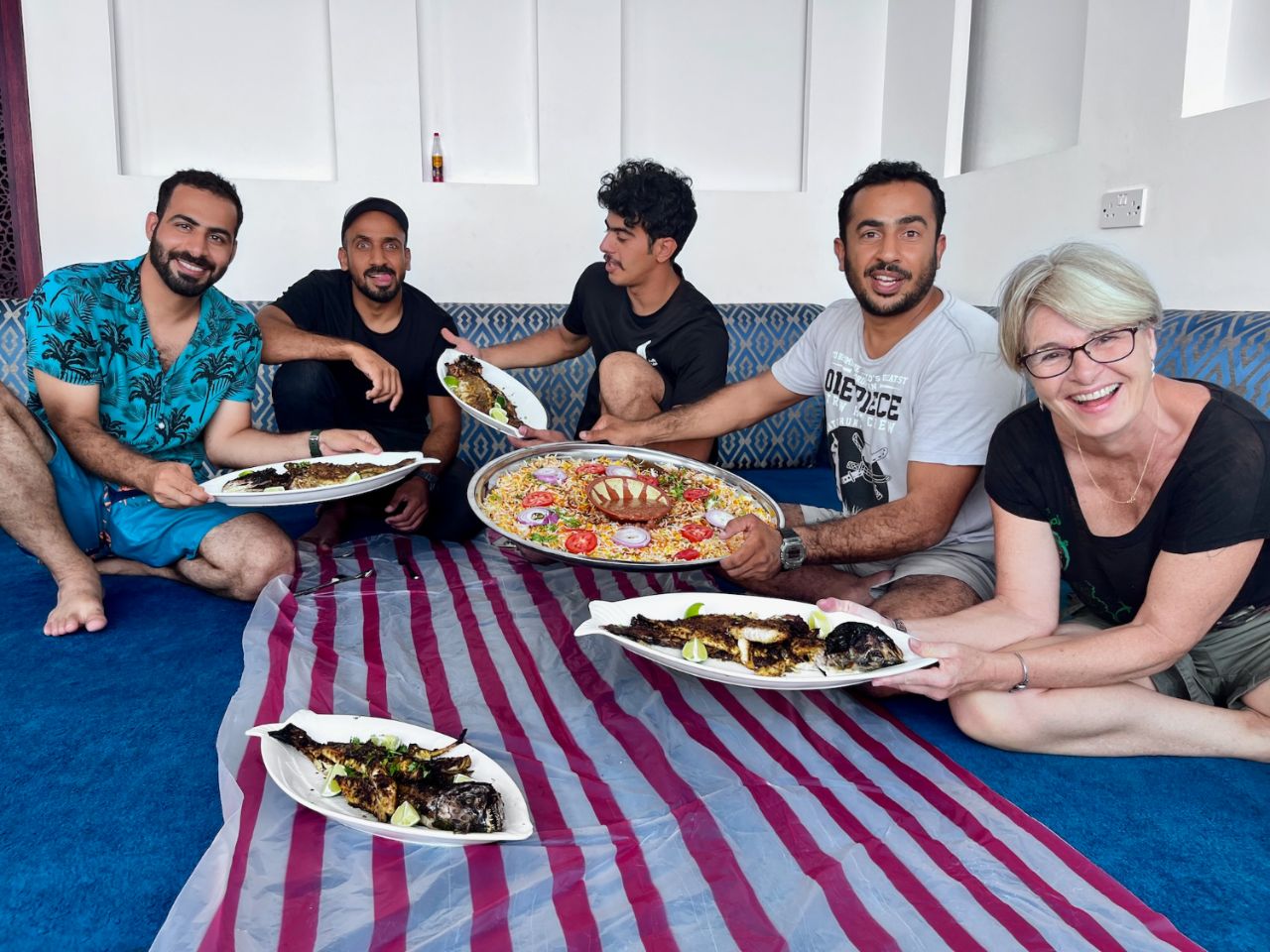 Pour nous l'occasion de se mettre sous la clim à volonté si besoin, d'attendre l'arrivée du fiston, de bricoler notre électroménager, d'aller découvrir 2 ou 3 trucs dans les parages et bien sûr d'en apprendre un peu plus sur la vie Omanaise. 2 frères et un cousin dont un influenceur, un prof de Kite surf... bonne ambiance assurée ! 🤪