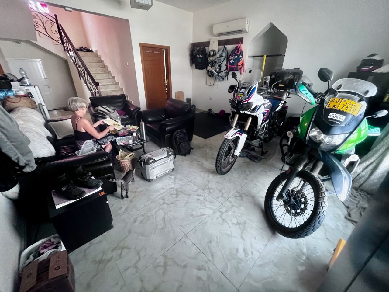 Les 3 jeunes rencontrés en montagne nous accueillent chez eux... 3 mecs dans une grande maison... A votre avis ça donne quoi ? ben c'est comme chez nous ! 😂 Les motos dans la pièce commune, des pièces qui stockent de tout et de rien, une cuisine qui doit fonctionner 2 fois par an...