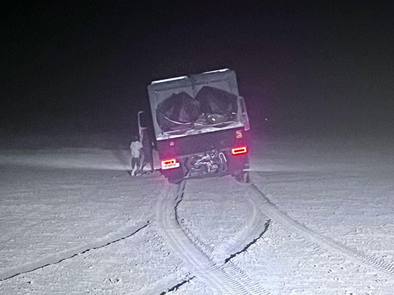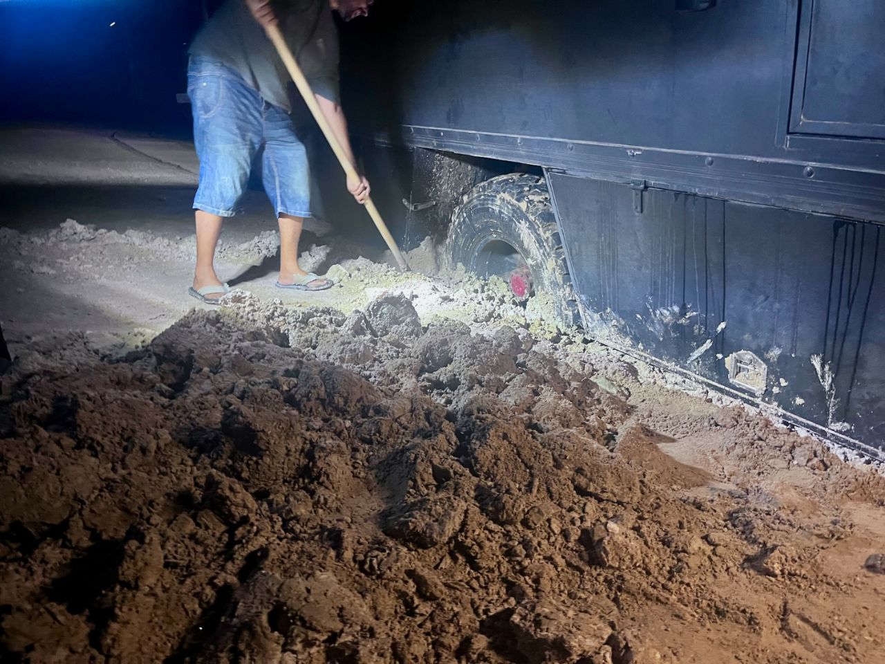 Il fait nuit et à 2 km, la piste renifle un peu le truc bien humide quand il pleut, ça rate pas, voilà mon Ami Alilouche du groupe whatsapp avec son camion bien penché, planté dans la mélasse ! 😂