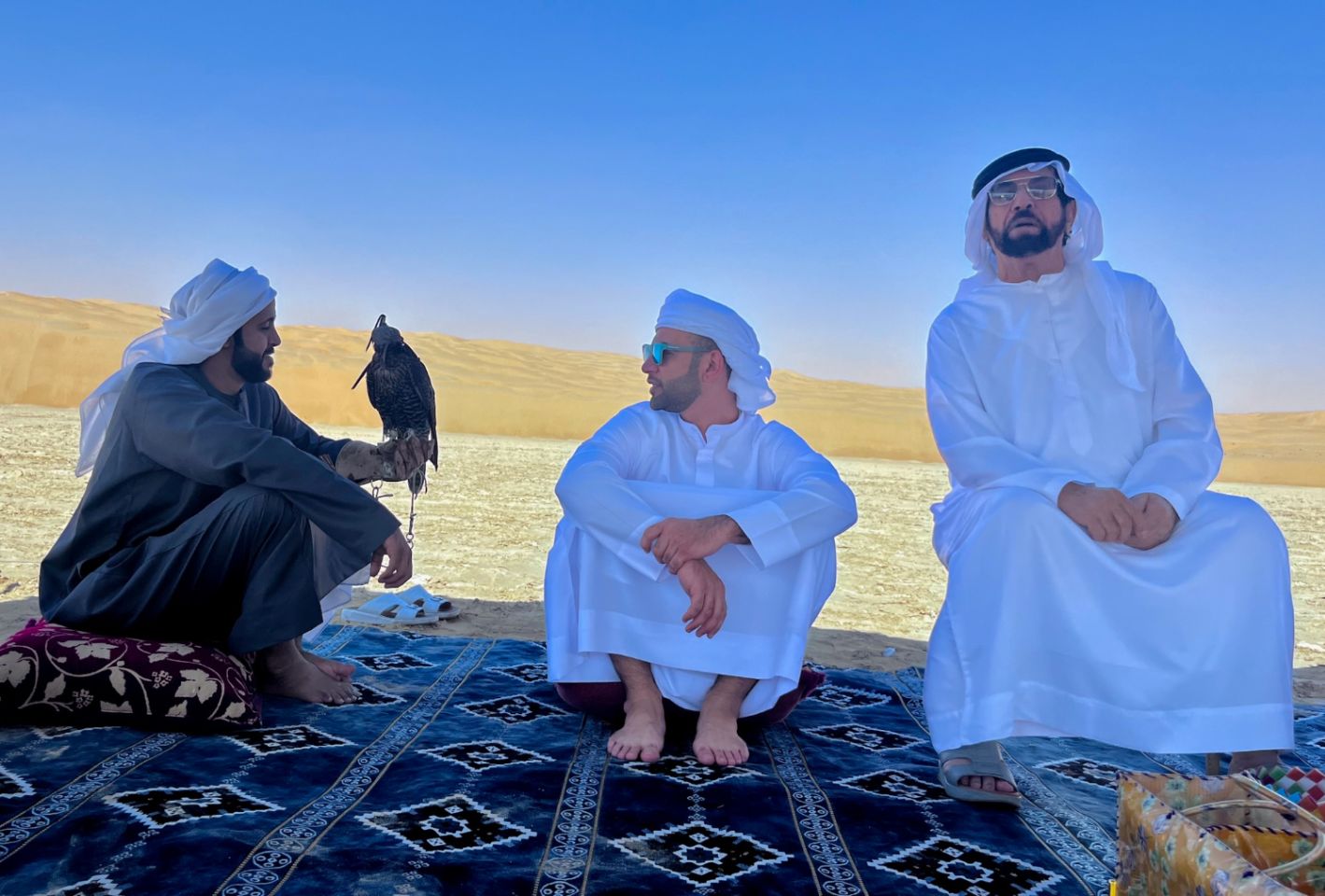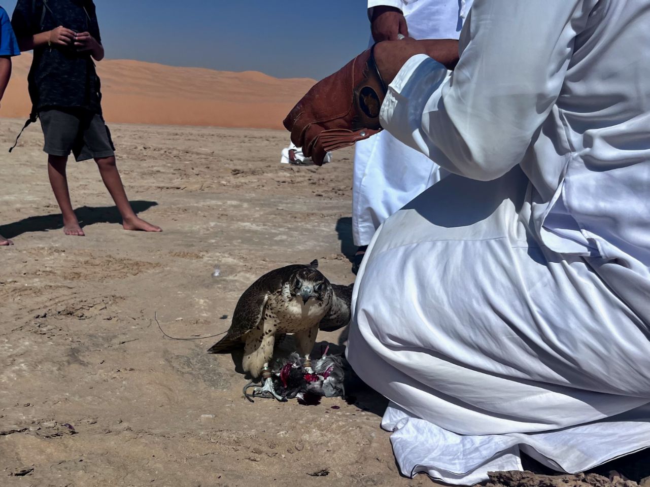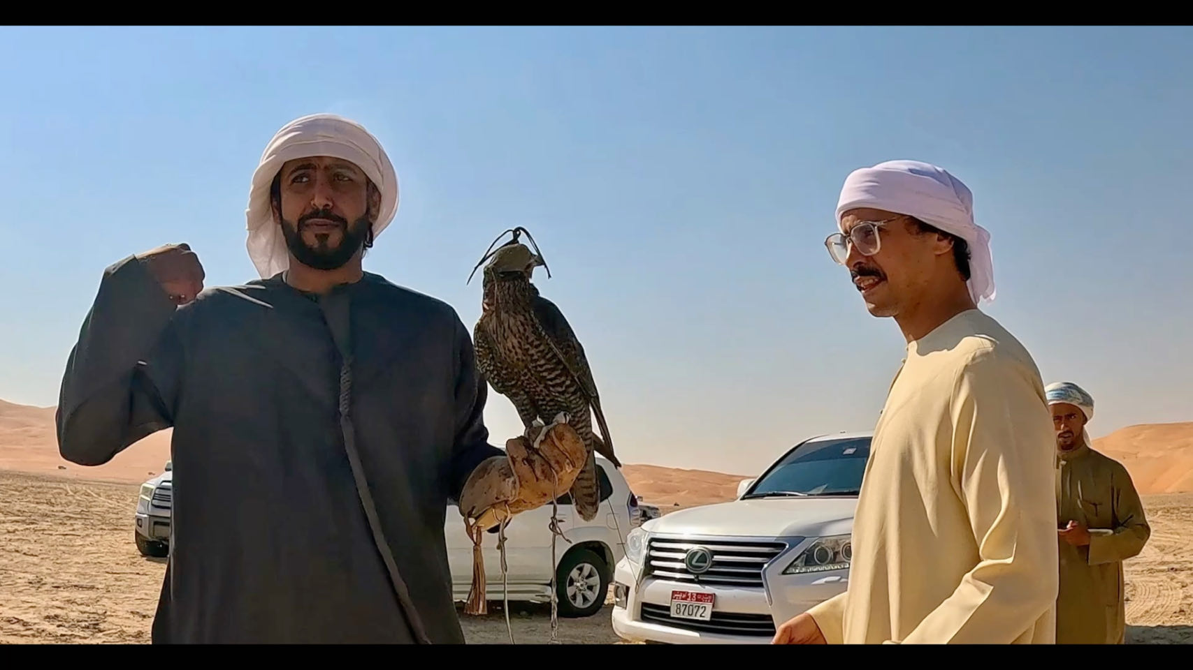 les Voilà les Emiratis ! et les faucons aussi ! Ayant trouvé refuge en compagnie d'autres voyageurs sympathiques dans une partie de désert plus calme, nous sommes conviés à une compétition de faucon chasseurs de pigeon. Bon qu'on se le dise, le pigeon, il a 95% de chances de s'en sortir vivant, à moins qu'il ne décide de vouloir rentrer dans un camion de ses cons de français présents sur le site. Ben oui faut bien que l'on se fasse remarquer.