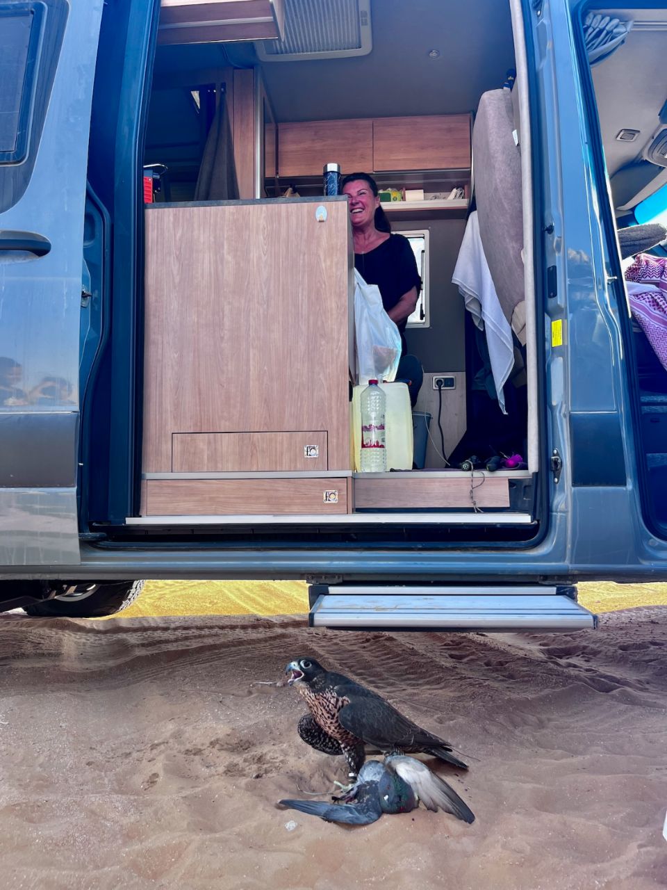 Here they are, the Emiratis! And the falcons too! Having found refuge with other friendly travellers in a quieter part of the desert, we were invited to a pigeon-hunting falcon competition. Let's face it, the pigeon has a 95% chance of getting out alive, unless it decides it wants to get into one of the lorries belonging to the French idiots present on the site. Of course we have to get noticed.
