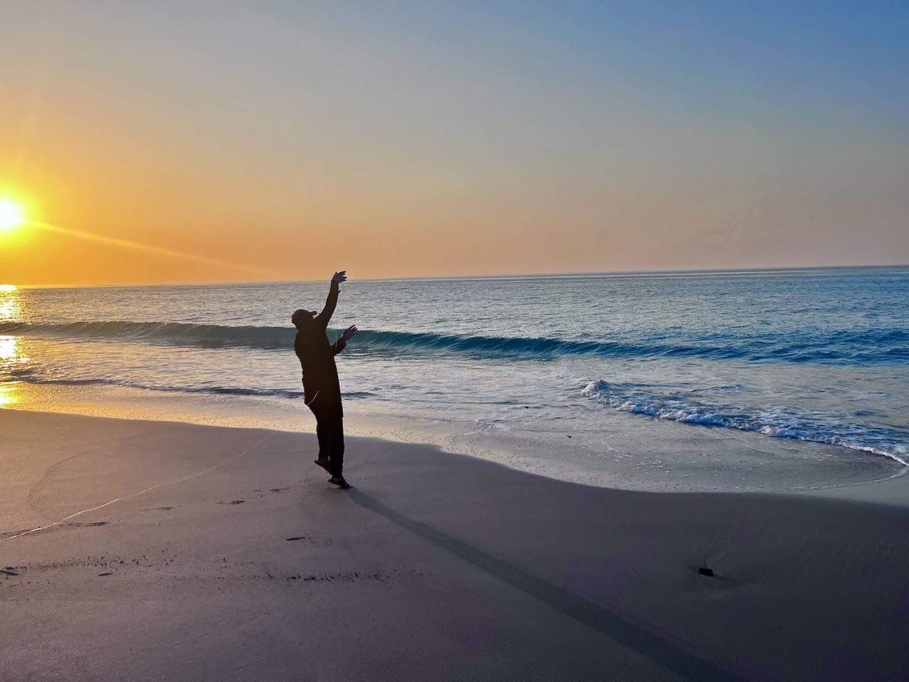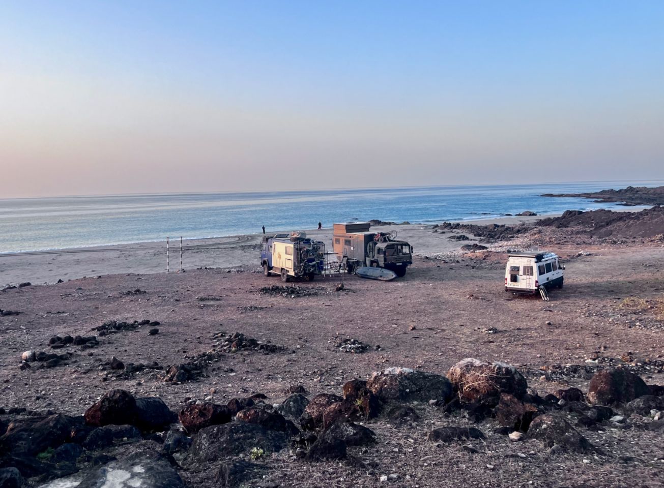 Plage choisie proche du Yemen, pas la plus belle car on va y aller crescendo 😂, déjà bien content de retrouver la mer et son eau à 25-27°, de filmer les coquinous de crabes qui se disputent la primeur d'un poisson mort (cf vidéo), d'encourager les pécheurs locaux qui lancent leur fil de pêche sans canne ni moulinet depuis la plage à 6h du mat, du soleil qui sort de l'eau le matin là-bas tout au fond...