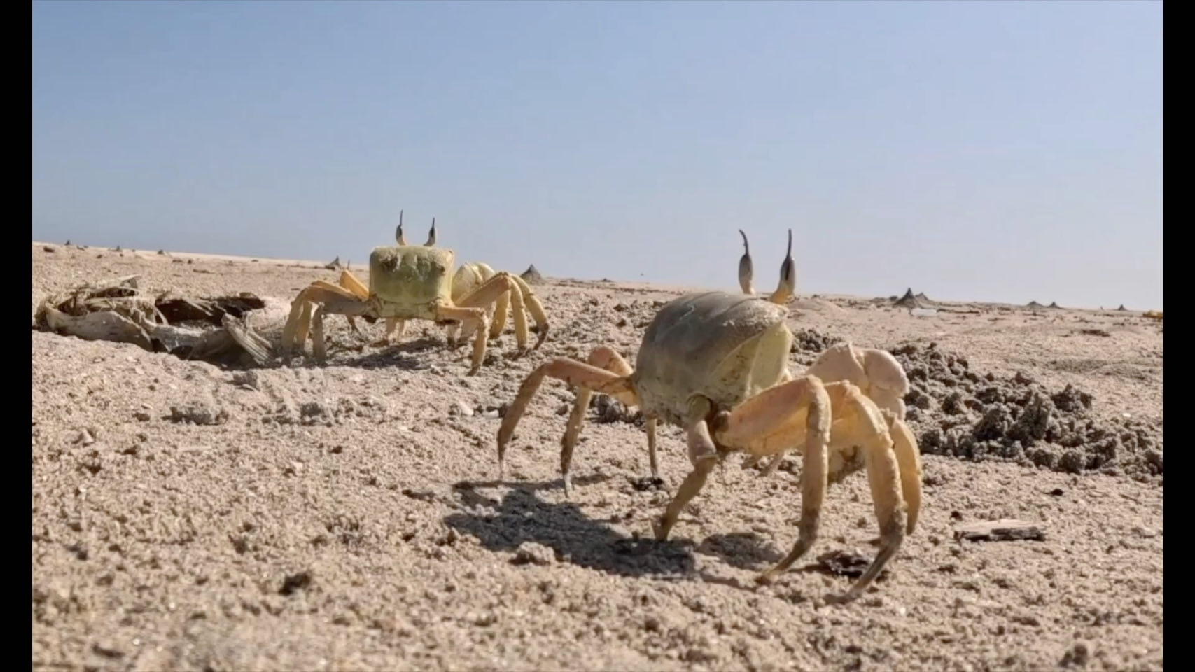 Chosen beach close to Yemen, not the most beautiful because we're going to go from strength to strength 😂, already very happy to find the sea and its water at 25-27°, to film the naughty crabs fighting over the prize of a dead fish (see video), to encourage the local fishermen who cast their fishing line without rod or reel from the beach at 6am, the sun coming out of the water in the morning over there...