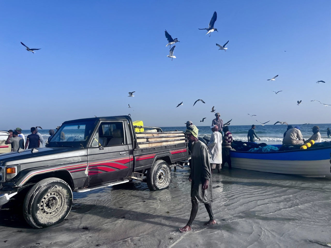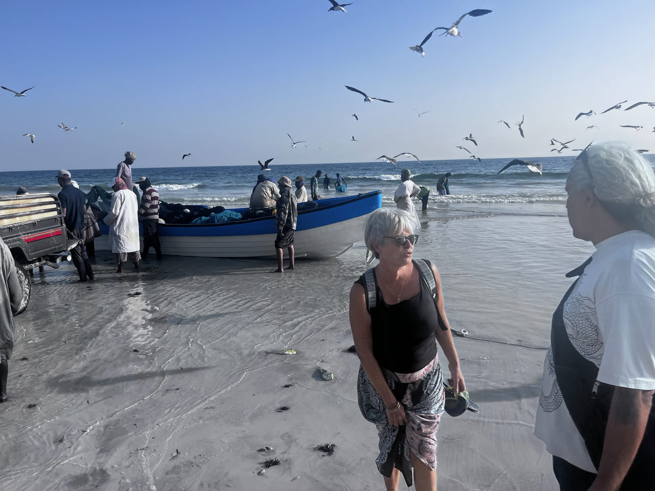 Always alternating... After the spring, the arid plateau and the firm wadi, a return trip a few kilometres away was in order: a little iodine at Khor Rori. A traditional beachside atmosphere... No, not an assortment of ice-cream parlours and umbrellas, but seagulls and the bustle of the returning fishing boats. All that's left to do now is to go for a swim 5 km further on, with Christian accompanying us, in a solitary cove, alone in the world.