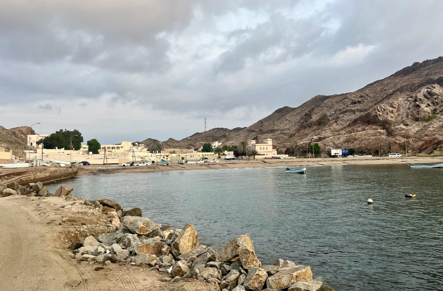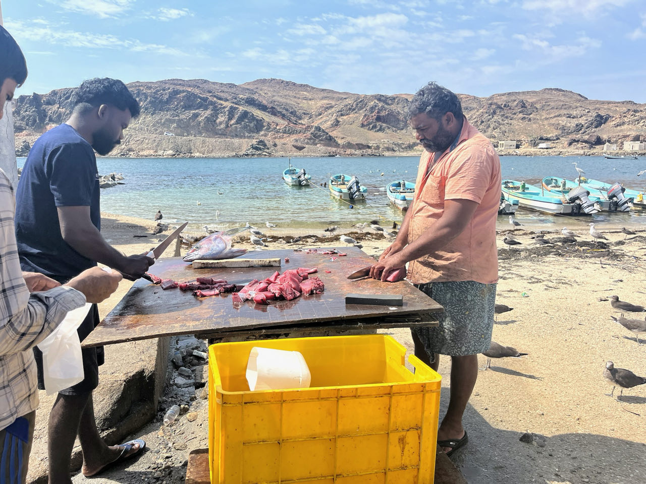 At the bottom of a valley, a well-sheltered cove, a quiet fishing village far from civilisation. When you go for a walk in the evening near the arrival of the boats, you are approached by an Omani coming to get some fish: "Where are you from, what's your name...". At the same time as he's talking to us and asking us questions, he mumbles and waves to the paki, who cuts up a big fish.