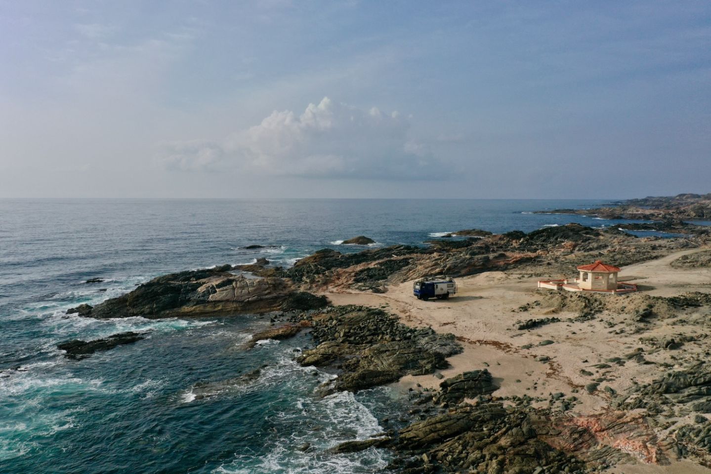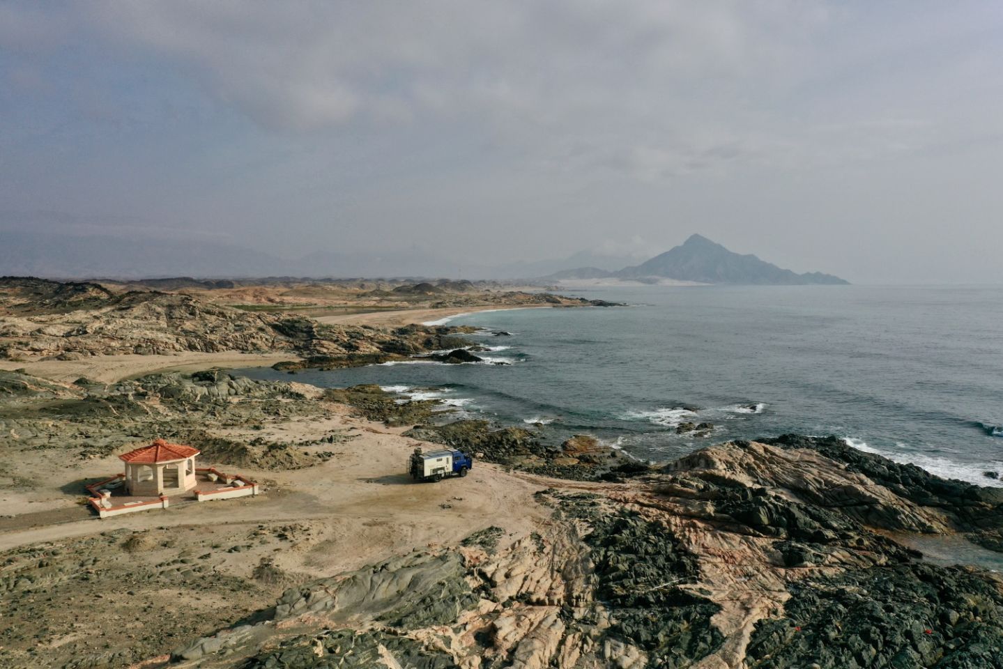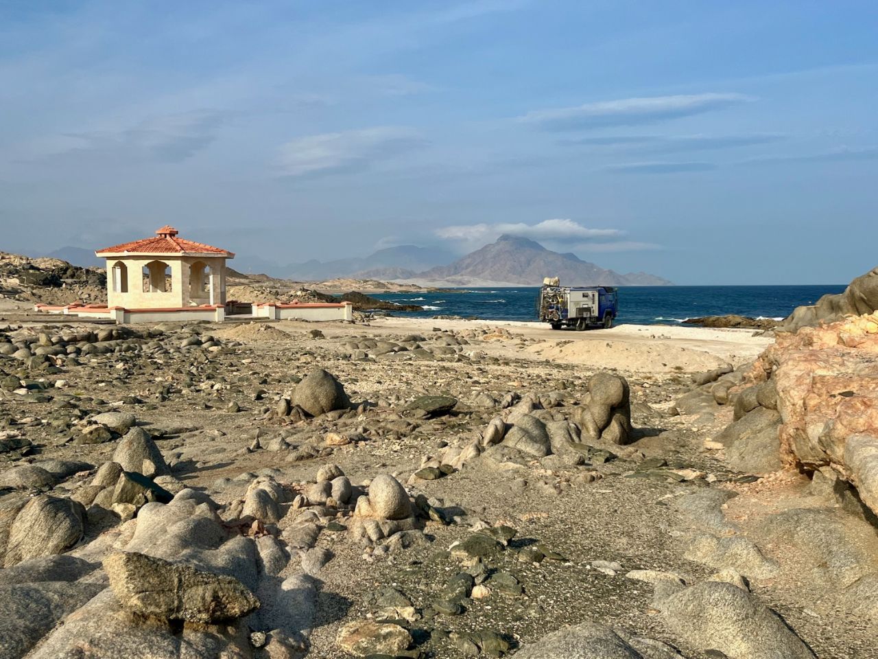Ce secteur est connu pour la présence de dauphins sympas et non apeurés. Alors premier arrêt dans une criquounette mélant sable et rochers, et équipé d'un carbet local. On en trouve un peu partout sur cette côte faisant sans doute le bonheur des Omanais en plein été lorsque leur saison des pluies bat son plein. Malheureusement les vents, le sel abîmeront relativement vite sans doute ses petites infrastructures. Bon pas de dauphins encore mais nous ne sommes pas encore dans leurs baies favorites...