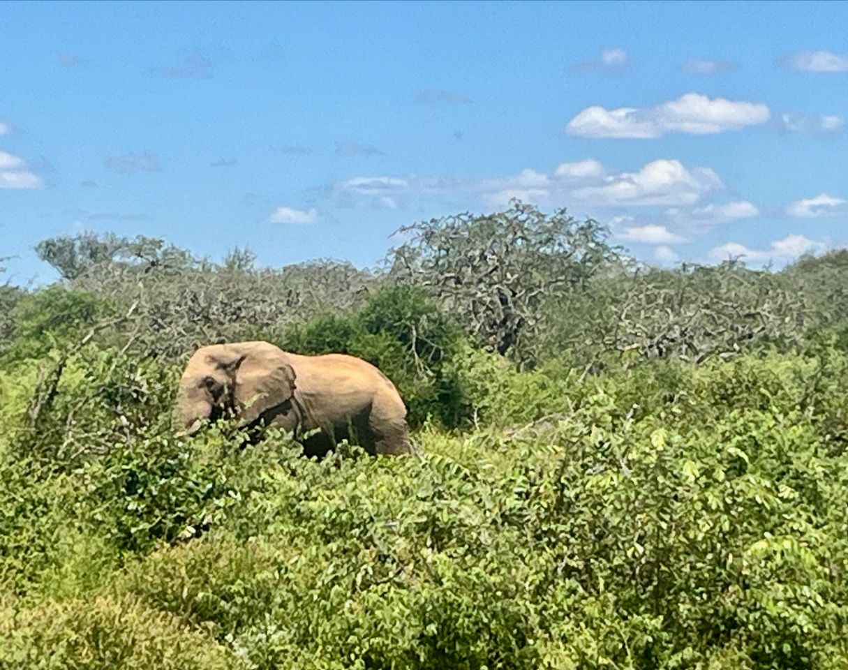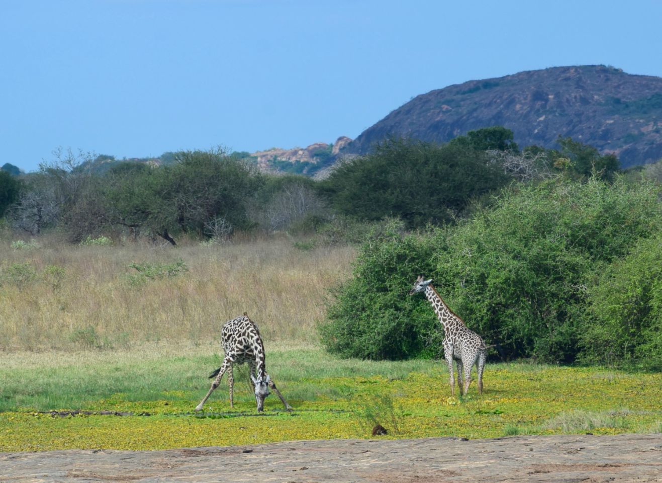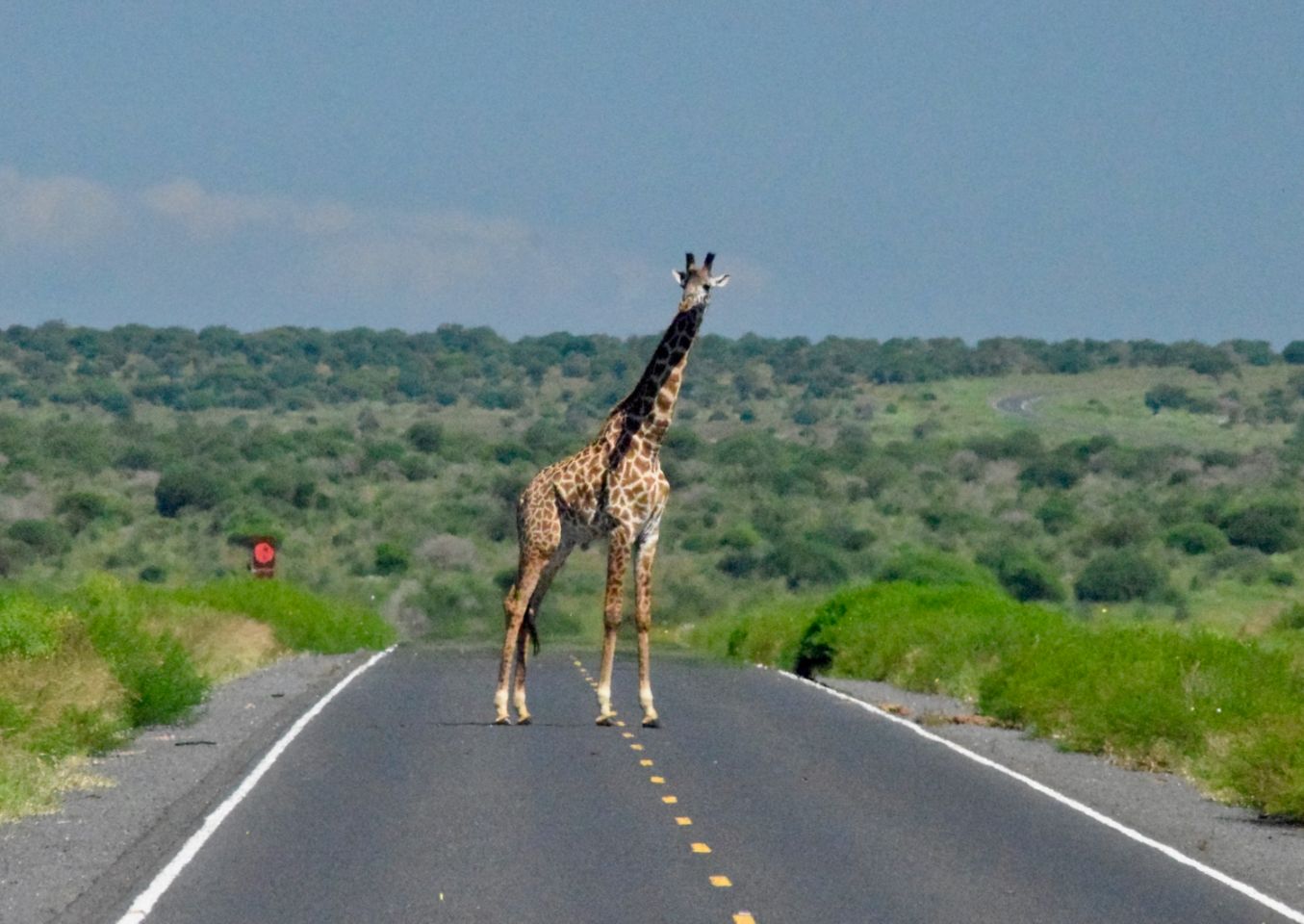 Dans cette zone sèche de savane nos copains les éléphants et nos copines les girafes se régalent, et nous aussi 🤪. Vu la taille de ces bestiaux, impossible de les rater surtout lorsqu'ils te barrent la route, comme ici en traversant le parc de Tsavo west. Finalement pas besoin au Kenya de payer entre 100 et 200 € par personne la journée pour voir ces animaux là. Petit à petit, le Kilimanjaro se rapproche et nous montre toute sa hauteur tous les matins. 🤪