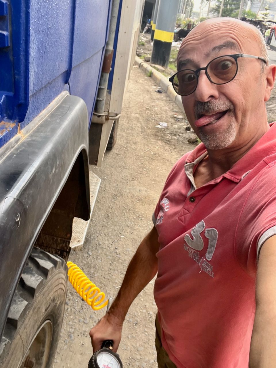 Prêt à partir, merdum un pneu est à plat. Regonflage, ça semble tenir. Mais dès que l'on roule nous entendons un Pschittt régulier. Une entaille sur le flan du pneu qui tenait jusque là est en train de nous lâcher. Faut faire 30 km. Gonflage tous les 5 km mais le Pschittt est de plus en plus fréquent. Nous arrivons à l'aéroport, faut regonfler tous les 2 km. Delphine sur le trottoir entend le Pschittt de loin. C'est pas gagné, il nous reste 15km pour arriver à notre garage d'amour. Même en regonflant tous les km, à 3km de l'arrivée, nous devons capituler. Notre garage viendra, enlèvera la roue, mettra notre pneu neuf que nous avions depuis les Emirats, nous le ramènera et le remontera. En une demi-journée c'était pliée. Toujours la chance du bon endroit au bon moment ! 🤪
