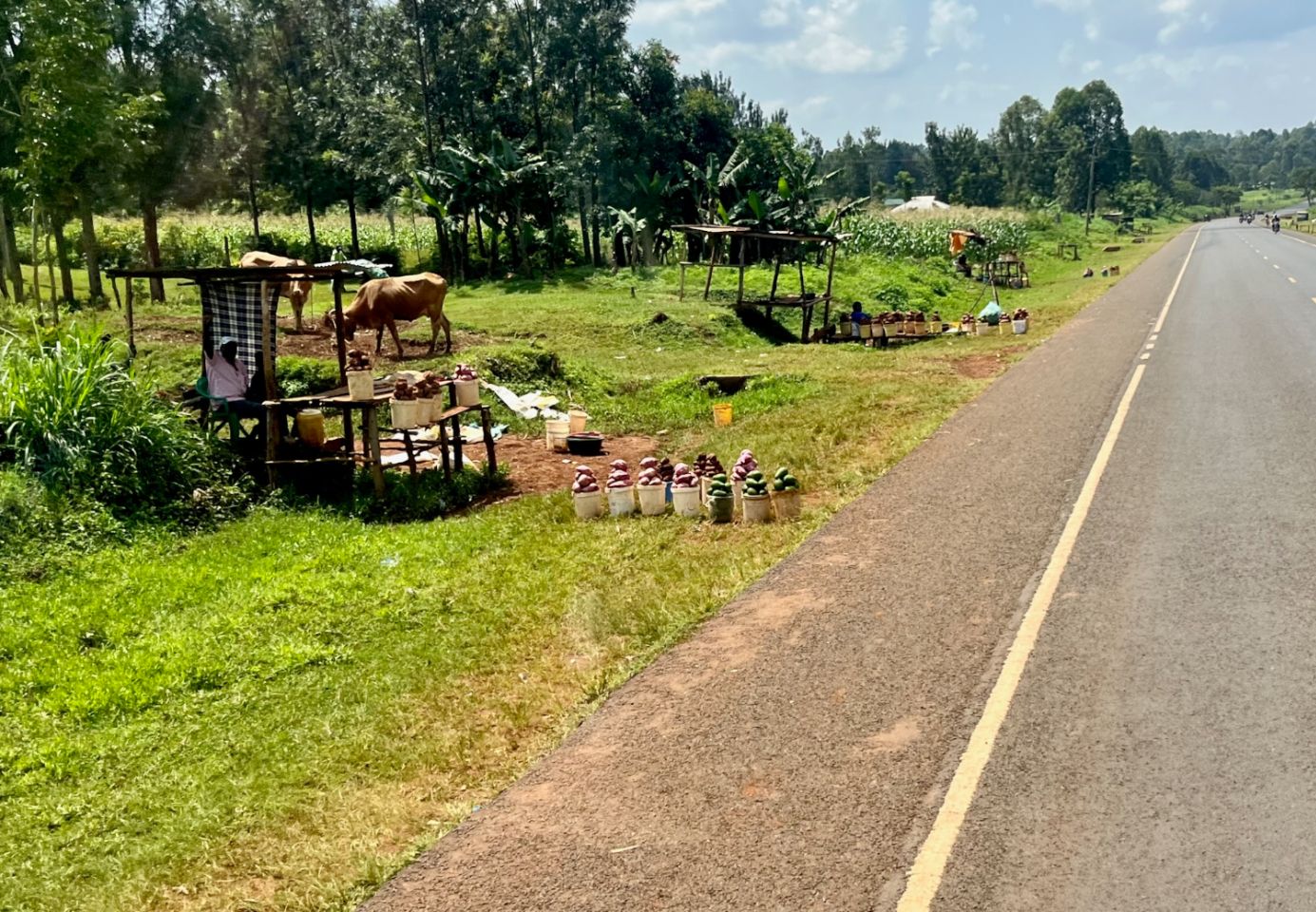Prenons la route du retour sur Nairobi, Delphine a quand même un billet retour sur la France... Du bord du lac Victoria et ses minus poissons séchés, sur le bord de la route, ce sont désormais les vendeurs de patates douces ou normales, d'avocats et de bananes, vendus au saut ou à l'unité. Circuit court au top, et prix tranquilou, exemple : les énoooormes avocats à 0,15€ pièce ou la banane quoi a un goût d'enfer à 0,07 €