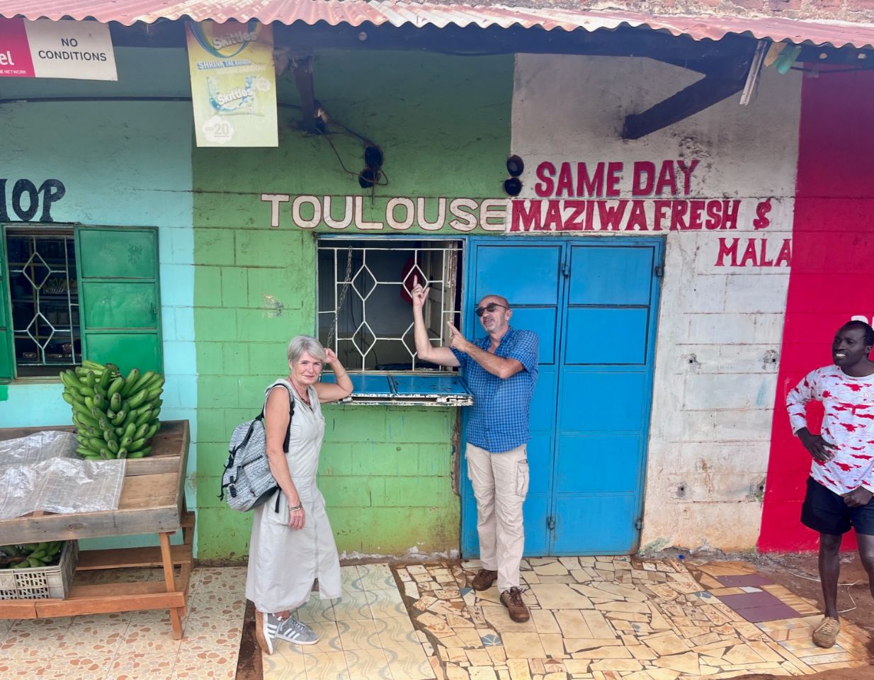 En allant voir la grand-mère, nous nous arrêtons au bord de la route dans un micro village. 2 échoppes arborent fièrement un "TOULOUSE". Nous y trouvons Benjamin Bitok, un cousin de Wallace. Un inconnu pour nous mais des milliers de personnes le connaissent, ou du moins ont essayé de lui courir après 😂. 5 fois vainqueur du marathon de Toulouse entre 2007 et 2013. Joli trophée ! Grâce à ses courses, le voilà à la tète aujourd'hui de son échoppe commerciale et de son restaurant (ici on appelle cela Hôtel). Un boui-boui africain de bord de route pas comme les autres... 😍