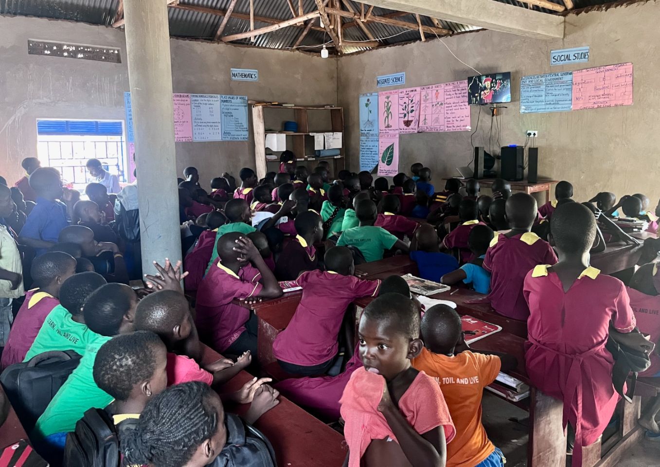 Another volunteer is also here for a month with his Ugandan partner. He provides a few maths and sports lessons, playing cards on occasion. In our own way, we all bring a breath of fresh air to the staff and to all these super-wise devils. TV in one room... We have a few films in stock on our computers. Cartoons! Yahouuuu it's a party! 🤪 Well, even if they've been shown several times because of the numerous power cuts, Shrek, Cars and Rox and Rouky in English with English subtitles are still great values!