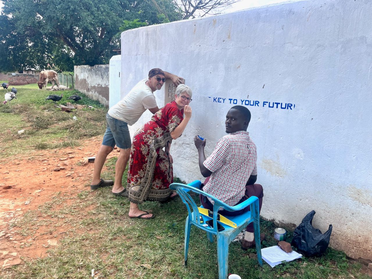 Nous y sommes en WorkAway, volontaires, nourris. L'anglais prédomine, ce qui facilite les échanges. Muriel s'oriente rapidement vers le côté assistante maternelle dans les petites classes. Après une courte période d'observation, je leur propose d'écrire une centaine de phrases sur des valeurs d'éducation, de famille, de santé, de respect, d'égalité et de commencer à peindre cela sur les murs de l'école. L'idée suscite beaucoup d'intérêt. C'est parti pour ma prune pour la cogitation des phrases, la réalisation d'un pochoir sur carton. Nous remarquons aussi que le secrétariat n'est pas des plus performants : la notion d'arborescence du disque dur en est au paléolithique de l'ordinateur et la connaissance de Word / Excel au niveau du 1er cours 1er niveau sur Multiplan ! 😳 Bref là où nous pouvons apporter quelque chose, nous le faisons.