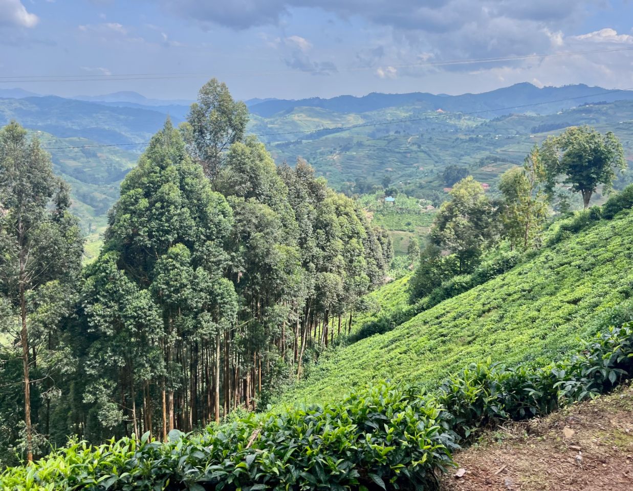 Direction la forêt impénétrable de Bwindi. Jusqu'à un peu plus de 2000m, les habitants montagnards font pousser du thé. Région de collines, parfois hyper abruptes, recouverte de ces superbes champs, exploit physique pour le ramassage, travail titanesque, herculéen, ici pas besoin de s'enfermer dans une salle de sport pour muscler les gambettes...