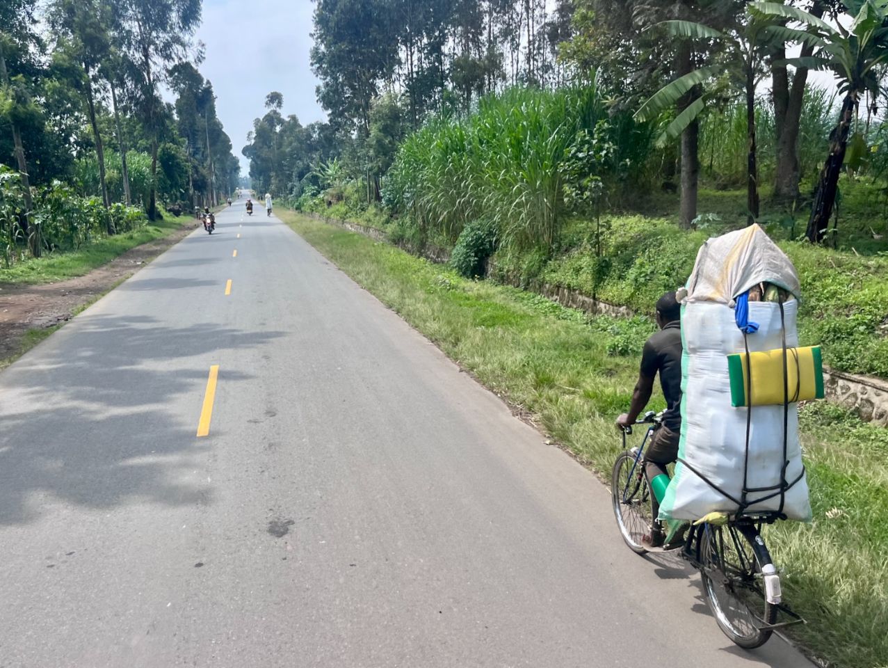 Mais toutes les routes ne sont pas encore goudronnées, ouf ! Au vu de la densité de la population au m2, des accès à des champs ou des terrains qui sont réduits à la taille d'un homme ou d'un vélo, au vu de l'absence de campings, les possibilités rwandaises en matière de bivouac sont limitées : monastères, foyer d'accueil, parking d'hôtels... La piste nous fait traverser des champs, des micros ponts de bois sur lequel notre Cargol transpire un peu. Puis nous grimpons au travers de collines très très vertes, remplies de maïs et bananiers jusqu'à atteindre le Foyer de Charité de Rutondo.