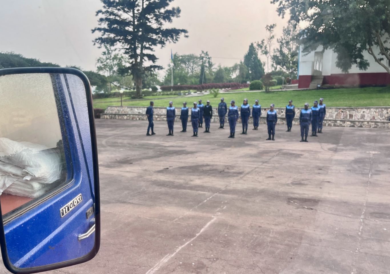 A la clarté de la première lumière sur le parking, 6h du matin, les gardes, où plutôt le service de sécurité du King's Palace Muséum, se réunit tel un bataillon sur une place d'armes. C'est quelque chose que nous retrouverons également plus tard au Rwanda en d'autres lieux, si minimes soient-ils. Être le chef d'employés chargés de la sécurité semble être ici une marque de statut social et le petit chef se la joue grand général des armées. Passage en revue de la petite troupinette, discours très long... pourtant y'avait rien de spécial aujourd'hui... 😂 Ne croyait pas que le site est immense mais ici au Rwanda, avec des salaires de base très faibles, les 'petits employés" sont légions pour surveiller le moindre portail, parking, bâtiments...