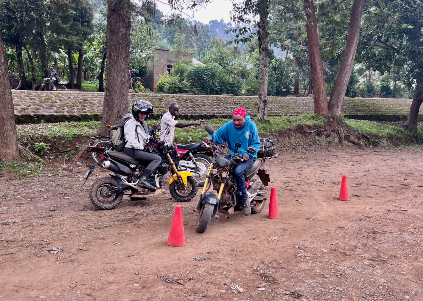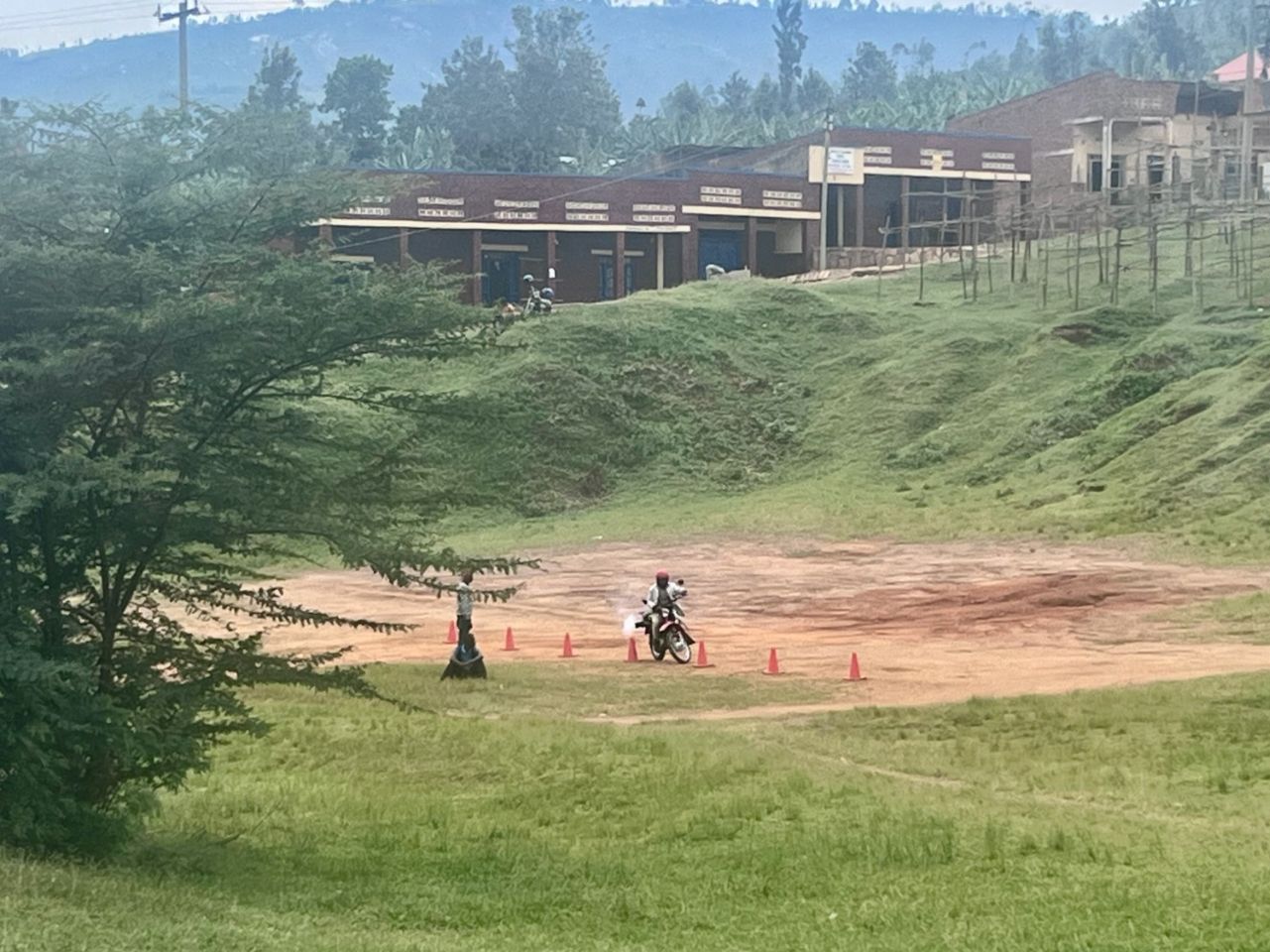 Un matin, pendant une pause thé improvisée entre deux cultures de piments, sur un terrain vague, poussiéreux, nous assistons à l'entraînement du permis moto version Rwandaise : quelques petits cônes et c'est parti : certains déhanchent avec style, d’autres semblent éviter des mines.