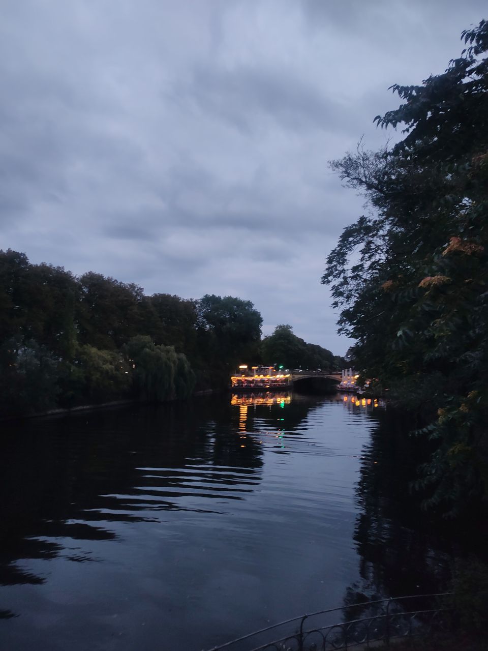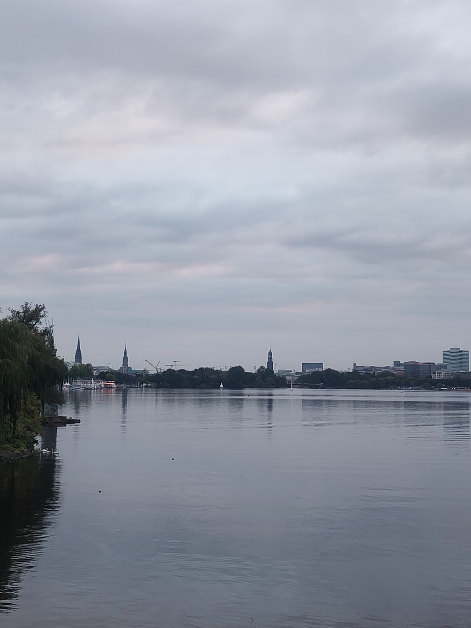 Compramos el heladito y pasamos para el lago que se llamaaaaa... Alsterwiese Schwanenwik (no me pregunten que significa). Hay patitos y fue lo que más me gustó, y que tiene una bonita vista panorámica de Hamburgo. Vi la torre de televisión que había visto en el bus cuando no terminaba de llegar.