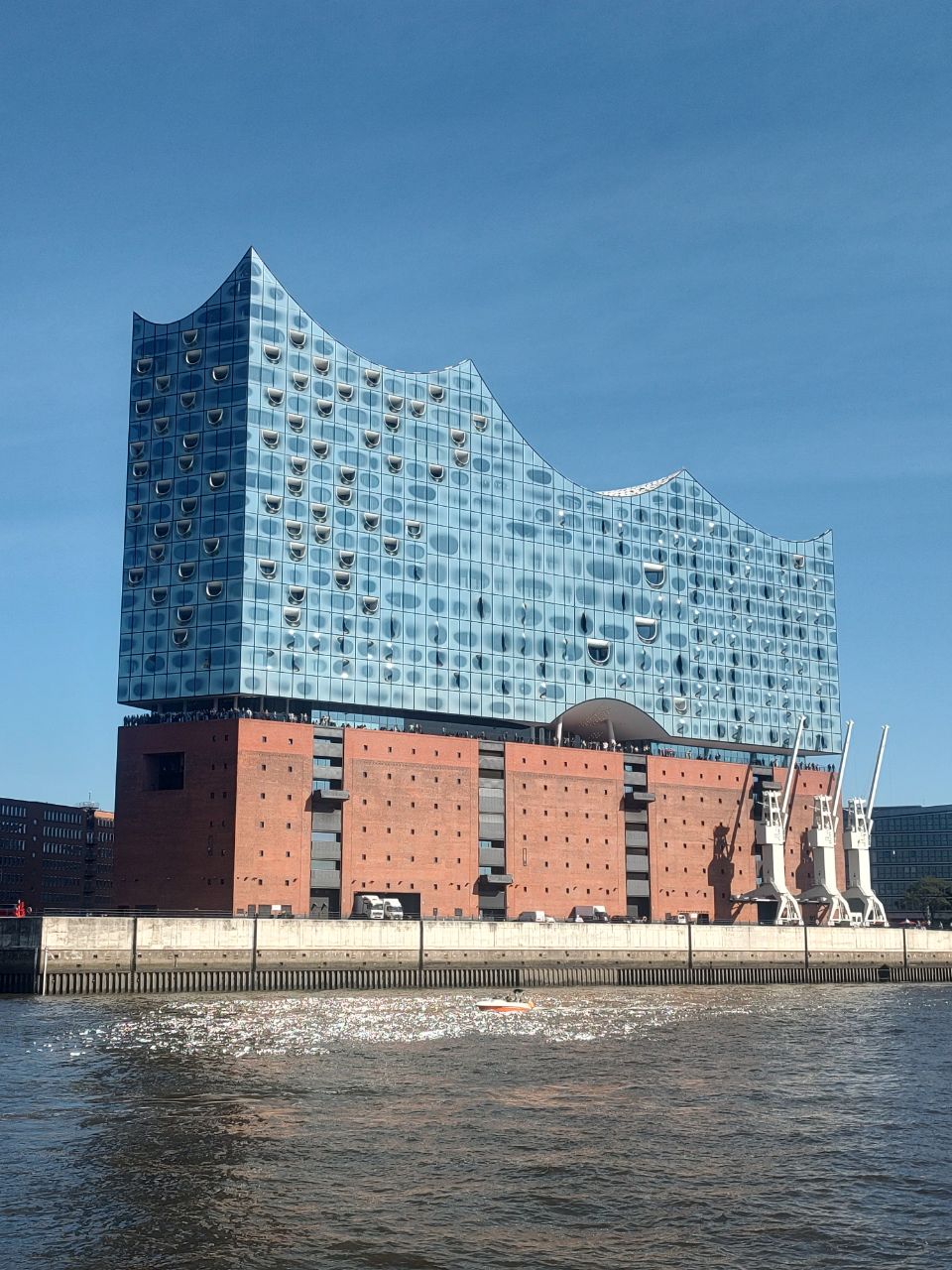 Tomamos el ferry bus que yo no sé para donde iba pero mis amigos si. Y resulta que paró al frente del Elbphilharmonie. Es un edificio enorme que se ve desde lo lejos. Mi amiga me explicaba que este edificio como muchos en Hamburgo, era viejo, pero luego de la guerra, en vez de tumbarlo completamente, construyeron arriba uno nuevo. Y así nació ese bonito edificio que tiene arriba unas formas de olas.