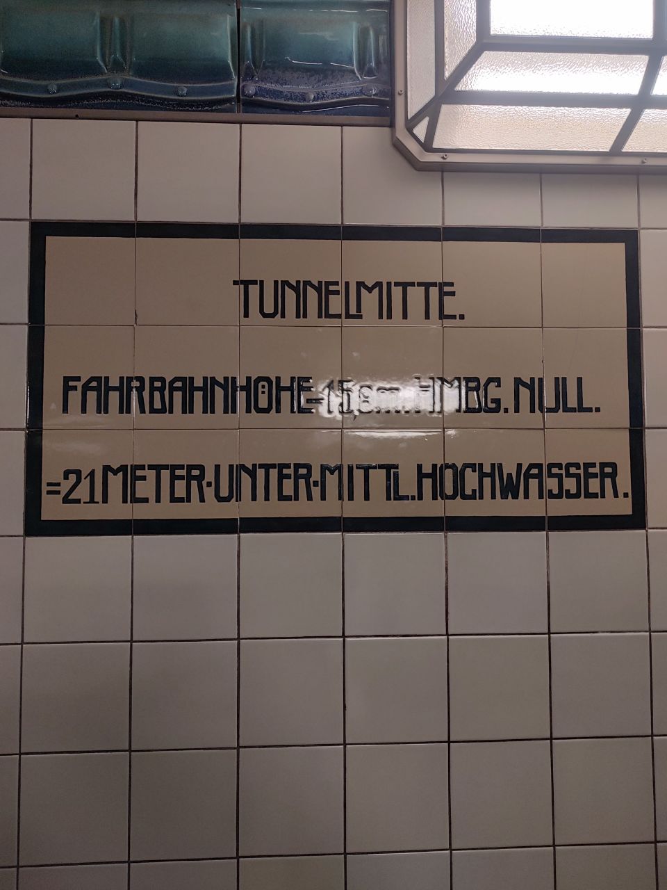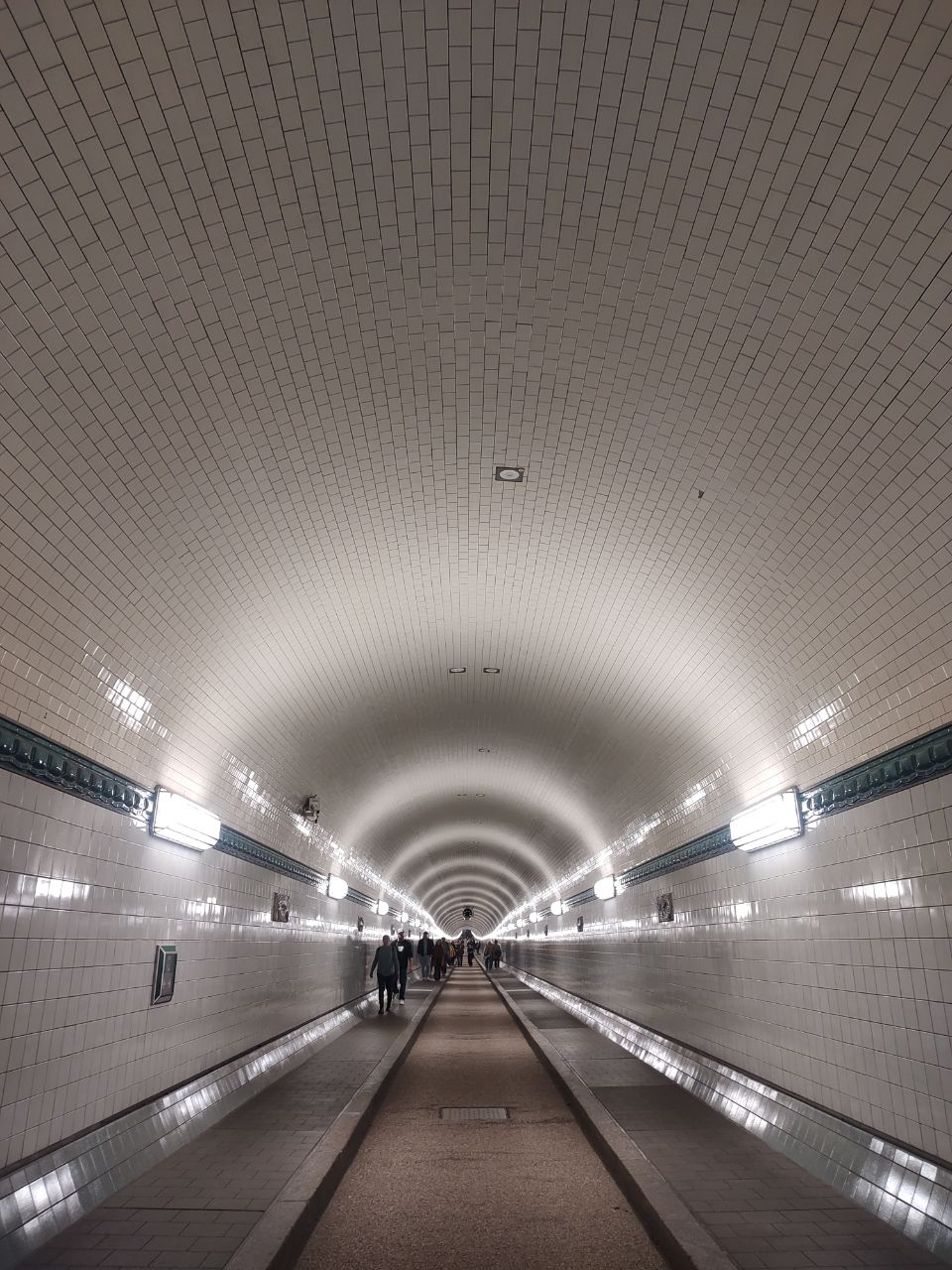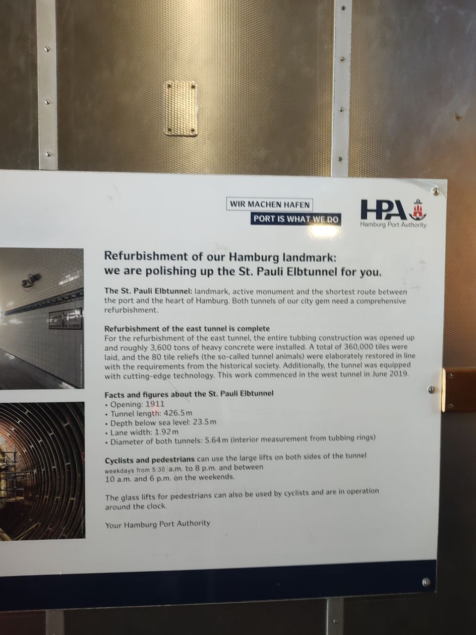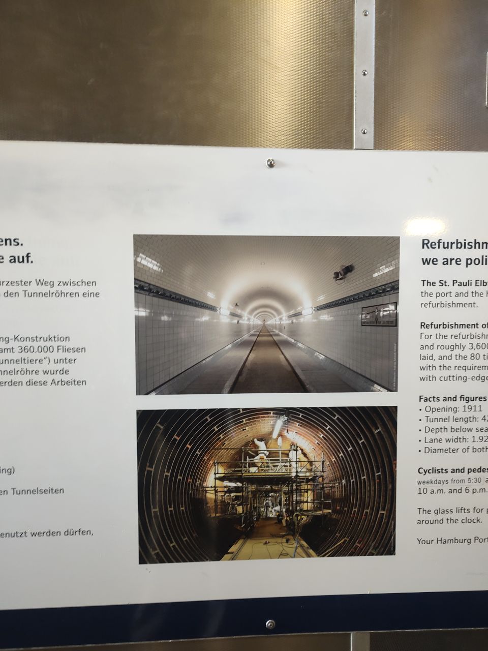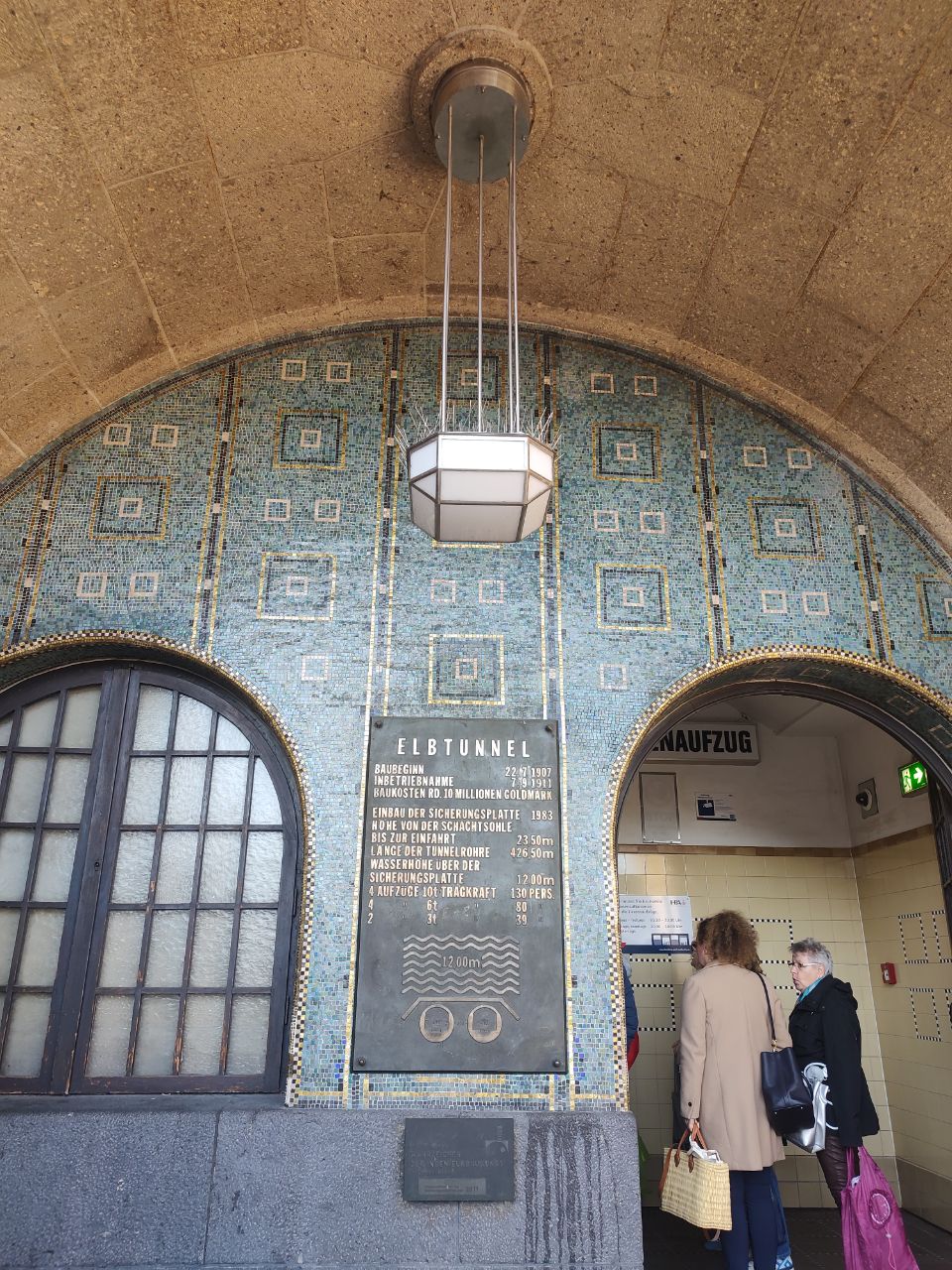 Luego fuimos al alter elbtunnel. Es un túnel que conecta a Hamburgo del otro lado del rio, por debajo. Y aunque antes pasaban autos, ahora solo pasan bicicletas y personas caminando. Es un túnel realmente muy muy bonito. Yo iba viendo los detalles de las paredes, la distancia y la presión que se siente pues está bajo el agua.