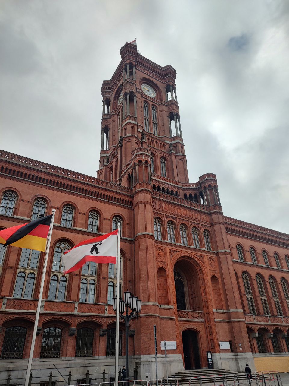 Llegué al punto de encuentro del free walking tour a la hora que indicaron y woooow. De por sí ya el Red City Hall o Rotes Rathaus es pffff impresionante. Eso habla de mi interesante que es Berlín en términos de arquitectura.