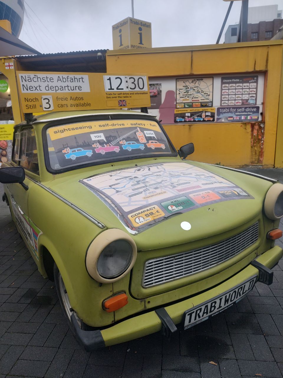 Seguimos el camino y nos explicaron el check point Charlie. El primer lugar donde ya veíamos la historia del muro de Berlín. Este lugar era el más concurrido día con día. Allí hay una foto enorme de lo que sería la representación de un militar estadounidense y en un costado hay uno de la unión soviética (este en realidad la foto es de un actor que calzó bien en la foto). Vimos un lugar donde se compran tours por la ciudad, pero lo curioso es que es en los famosos autitos que se comercializaban en la época.