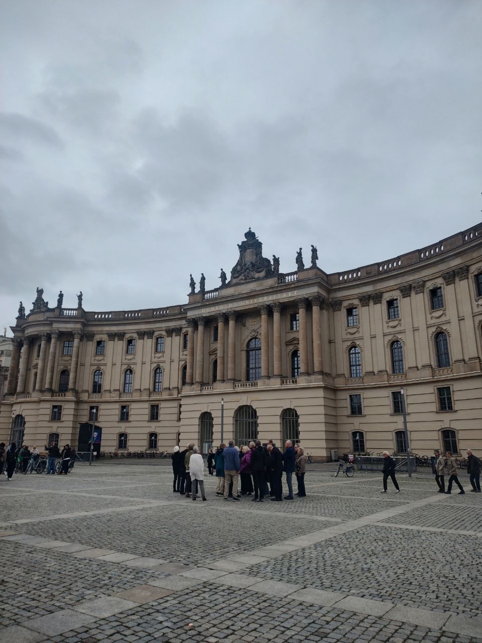 Seguimos y paramos en una universidad que es muy famosa (Humboldt University of Berlin) y que se puede estudiar completamente gratis allí. La cosa es lograr un cupo ahí. Bella explicaba que lo curioso no es la universidad sino donde está ubicada. Está al frente del lugar donde ocurrió la primera quema de libros, hito histórico que habla de como la base de todo era limitar el conocimiento. En esa plaza también está un teatro famoso a dónde los Nazis les gustaba ir a ver arte (el Berlin State Opera). El lugar fue destruido y vuelto a construir. También un homenaje a esa quema de libros, donde hicieron en el subsuelo una biblioteca vacía del tamaño donde cupieran todos los libros que allí se quemaron. Era una biblioteca vacía bastante grande. El Memorial to May 10, 1933 Nazi Book Burning.