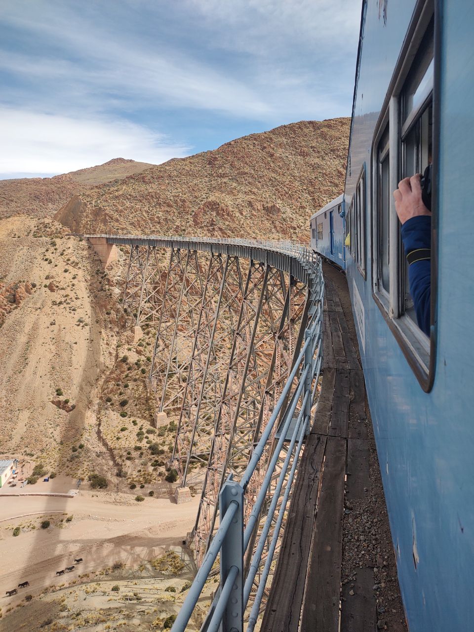 Seguimos la ruta y en el camino se ven unos paisajes muy hermosos, siempre subiendo mucho más en altitud. A eso de mediodía llegamos a San Antonio de los Cobres, que es donde se encuentra la estación del tren. Llegamos, esperamos unos minutos mientras los responsables organizaban la salida, subimos y arrancamos.
