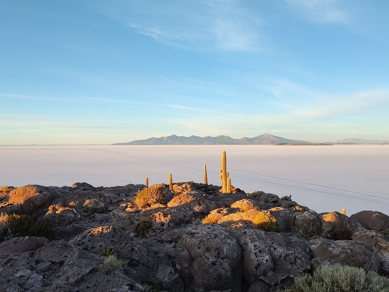 Arranca el último día de nuestro viaje a las 4am. En media hora nos alistamos y salimos. Iniciamos la ruta al salar con el objetivo de ver la vía láctea antes de que saliera el sol. Tomamos fotos (con mi teléfono imposible) y comenzamos a subir la isla de Inca Huasi. Es una pequeña escalada pero pues a esa hora y con ese frío, se siente eterna (por cierto, yo tenía seis capas de ropa para el frío). Hay que pagar 30bs para subir la isla.