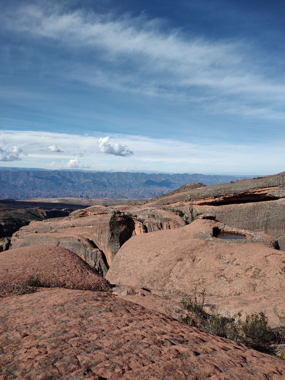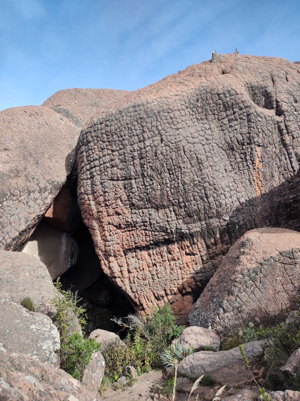 Anduvimos eso de una hora subiendo cada vez más por las montañas que desde el pueblo se ven enormes. Después de tanto, la camioneta paró y nosotros nos bajamos. Comenzamos el trekking que es todo escalar y serpentear entre rocas enormeeeeeeeees! Para al final poder tener un avistaje de todo el valle. Hubo un momento que ya no podía escalar más las piedras entre lo cansada que yo estaba y lo enorme de las piedras, pero pues mi energía volvió milagrosamente cuando el guía me alertó muy seriamente que no me retrasara del grupo pues hay pumas en la zona.
