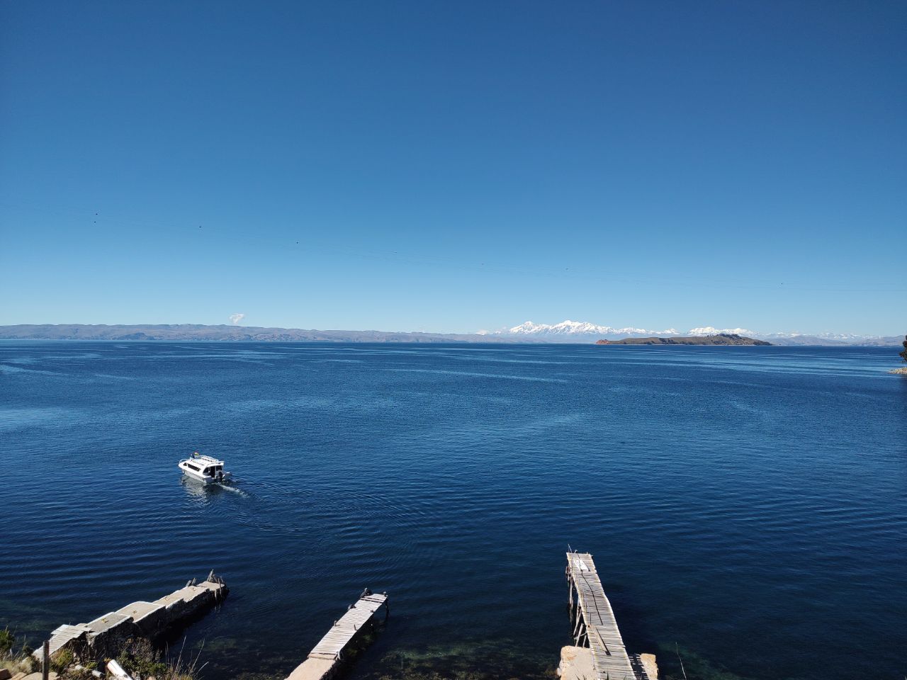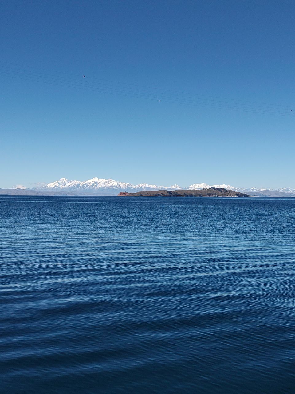 Después de buscar a todos salimos hacia el Alto para emprender el camino a Copacabana. El guía nos dió algunas instrucciones sobre el viaje y lo que veríamos a continuación. Después de pasada la ciudad, se comienza a ver las montañas enormes llenitas de nieve 🏔️ un paisaje hermoso. Al cabo de un rato paramos 10min a ir al baño y comprar alguna galleta en una estación de servicio.