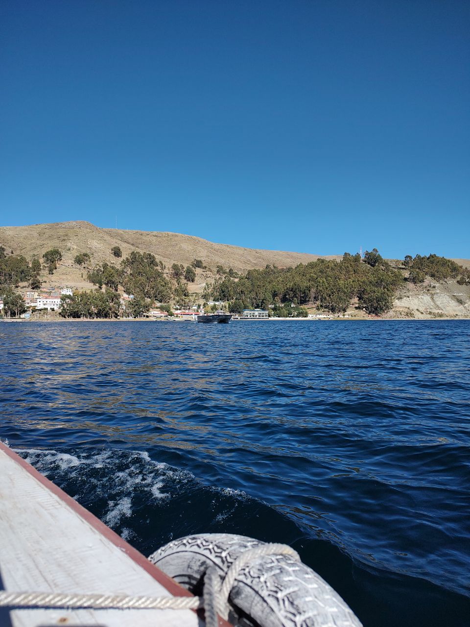 Seguimos el camino hasta que llegamos a Tiquina. Allí hay que bajar del bus para pasar las personas en una lancha y el bus en otra lancha jejeje. Es muy bonito el paso y demoramos unos 10 minutos.