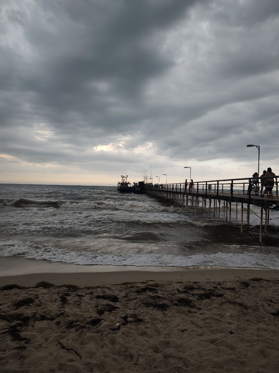 Después de eso me fui a pasear por la playa. El oleaje se veía un poco fuerte así que no me animé a bañarme. Recorrí la costa hasta llegar a un muelle súper largo, para tomar algunas fotos. Subí al muelle y me quedé un ratito por allí contemplando el lugar. Estaba súper nublado ⛅ así que no prometía un bonito atardecer así que volví a buscar algo de comer pues estaba solo con el desayuno.