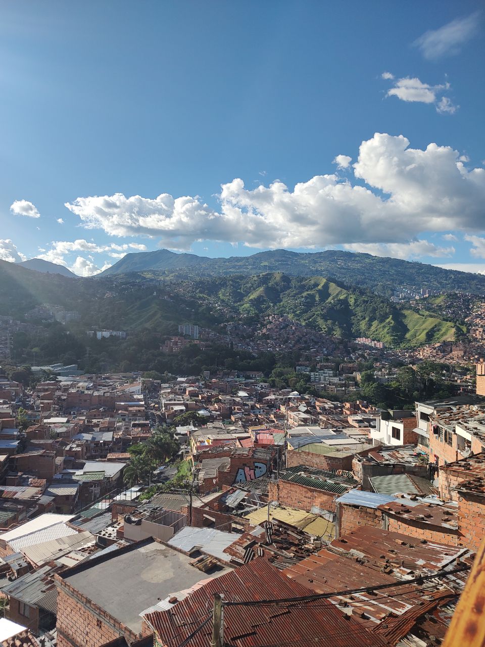 Subimos unos 15 minutos en el bus, nos bajamos y en la misma plaza comenzó nuestro guía a contarnos sobre la historia de la comuna 13. Sin duda una historia muy triste sobre las crueldades que se vivieron en ese barrio a causa de los grupos armados que tenían el poder. Sin duda es para reflexionar. También nos contó como actualmente ha cambiado la situación, gracias al empoderamiento de los mismos habitantes que ya no quieren ser recordados por el peligro, sino por la buena comunidad, el arte y la cultura.