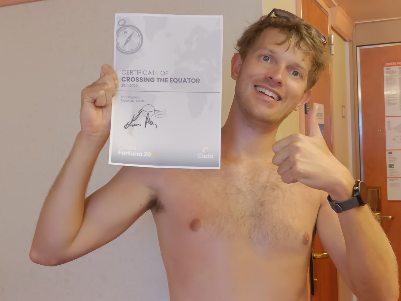 Passed the equator! De evenaar gepasseerd! Aan het donkere blauwe water is niets te zien en op het schip vieren we het pas 12 uur later met een poolparty én certificaat met de handtekening van de captain, woehoe! Op dezelfde avond ook het Captain's dinner: doel alle handtekeningen van de stewards verzamelen door met iedereen te dansen. Dit spelletje slaan we over ;)