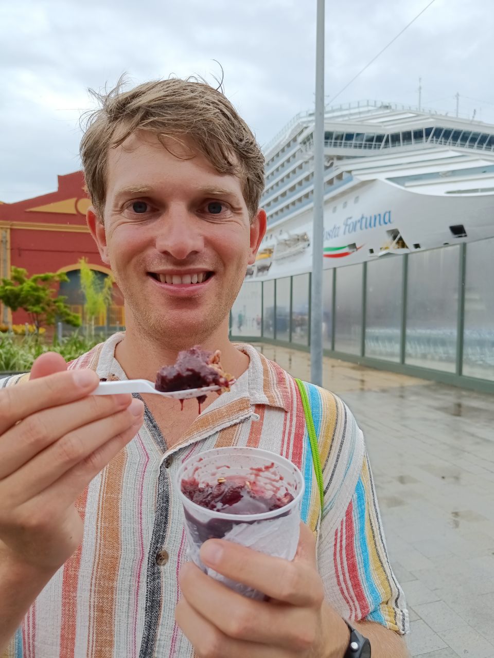 Welcome to Rio! We had some time off and took this opportunity to walk into nature, uphill next to the Sugarloaf mountain. While entering the area we were confronted with warning about venomous snakes, but we only saw a money and an oppossum. Just before we boarded we had some tasty açai, a Brazilian dessert! Oh and we made it to the Brazilian news, got interviewed in the port -thought we would never see it - until someone on the boat approached us 'you are famous' https://www.youtube.com/watch?v=i8ZfLl_jNvQ (something about football)