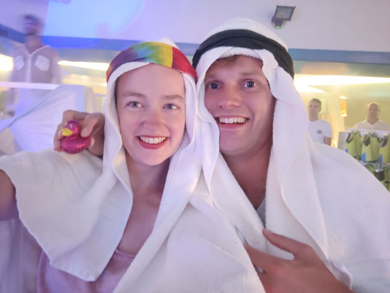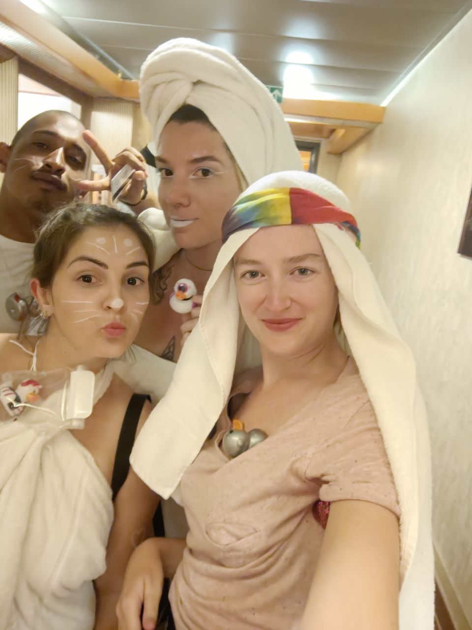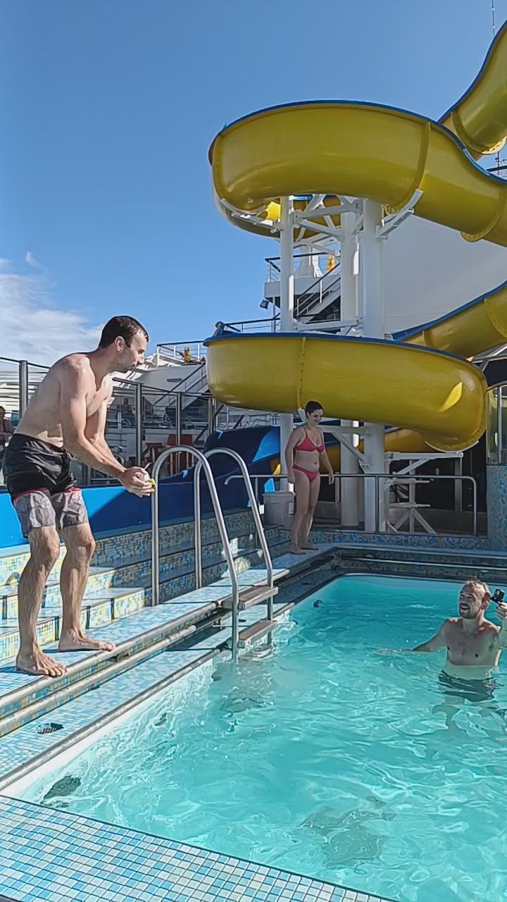 Meanwhile on sea... Lots of fun with the great people we met on board. Unfortunately they leave us in Rio. During the white teamed party we all showed in our towel costums -since a lack of white clothes- and during the day we held the Pato (duck) Olympics, seeing which duck+owner was the fastest on the slide (Frank made it to the second place)