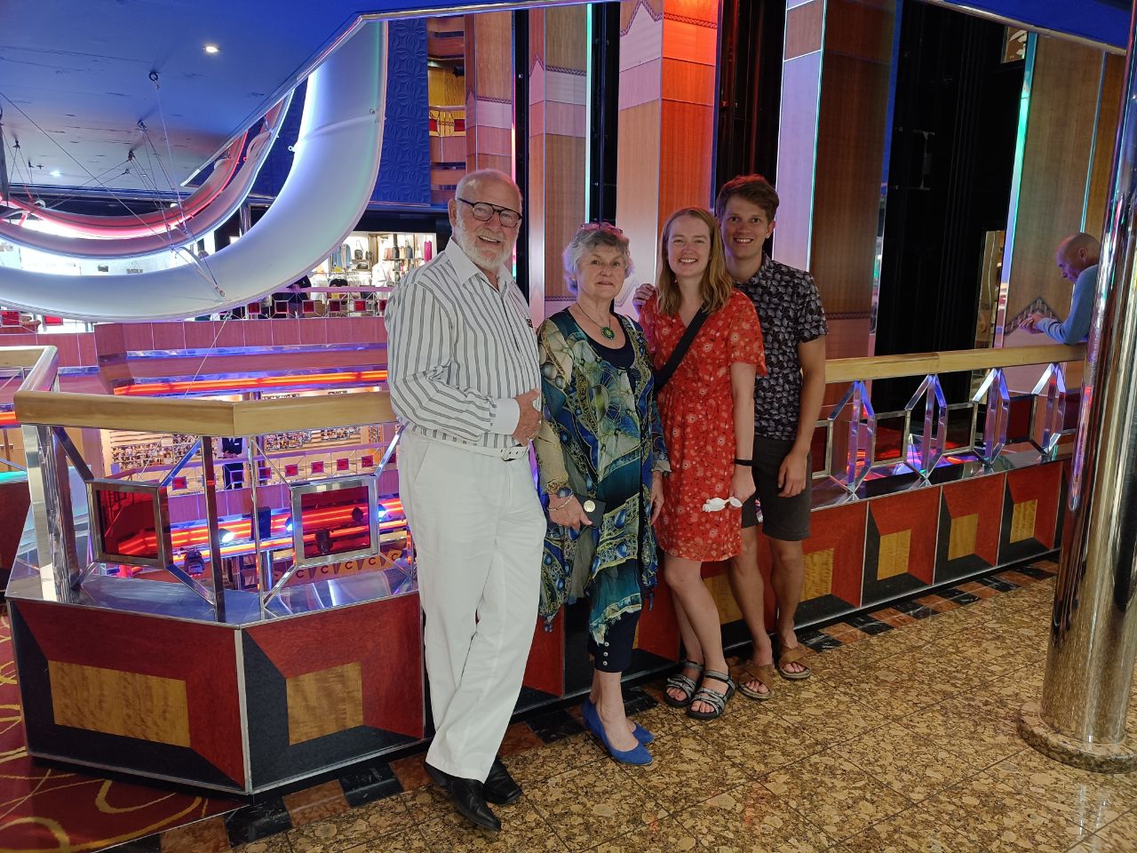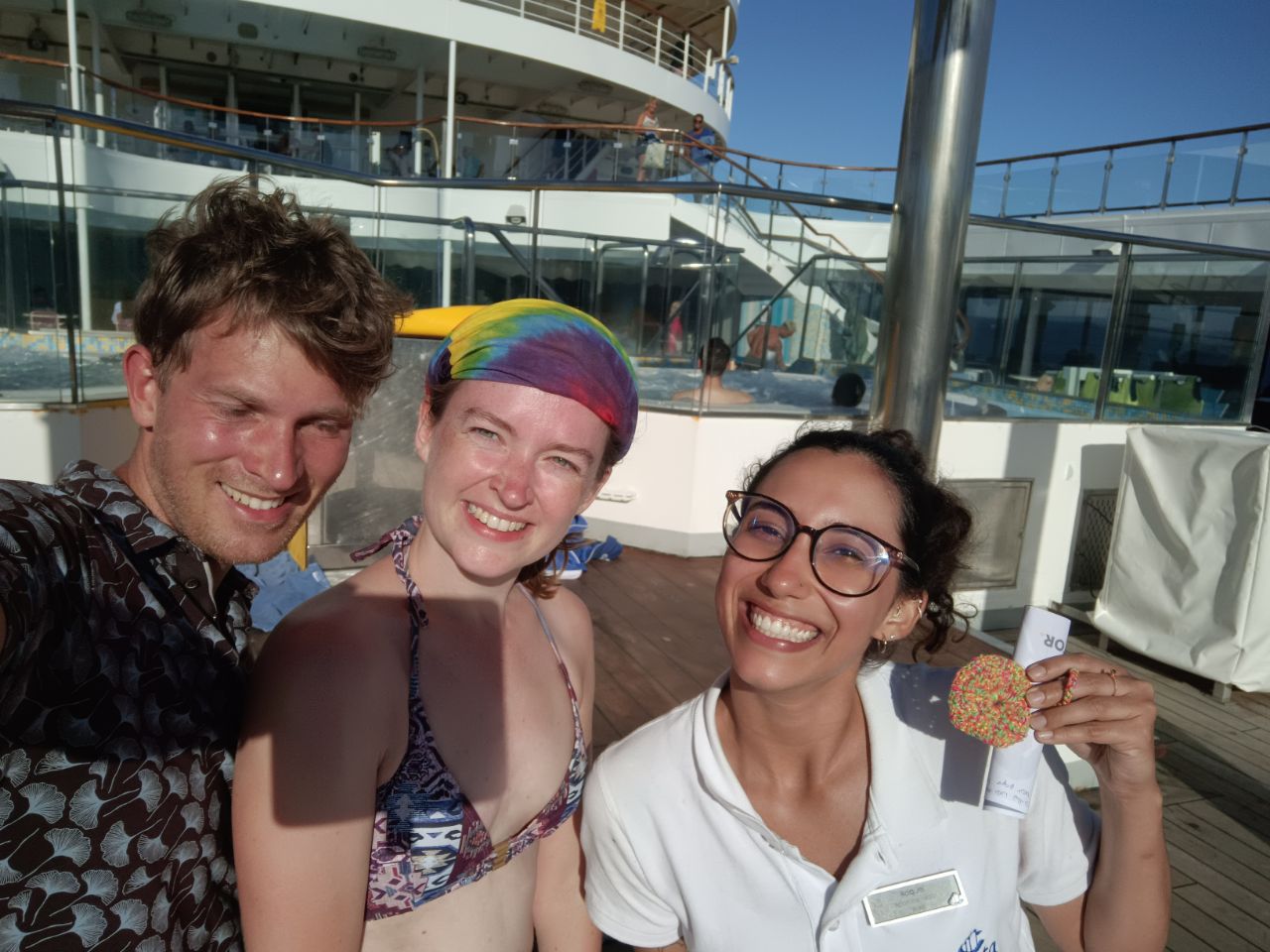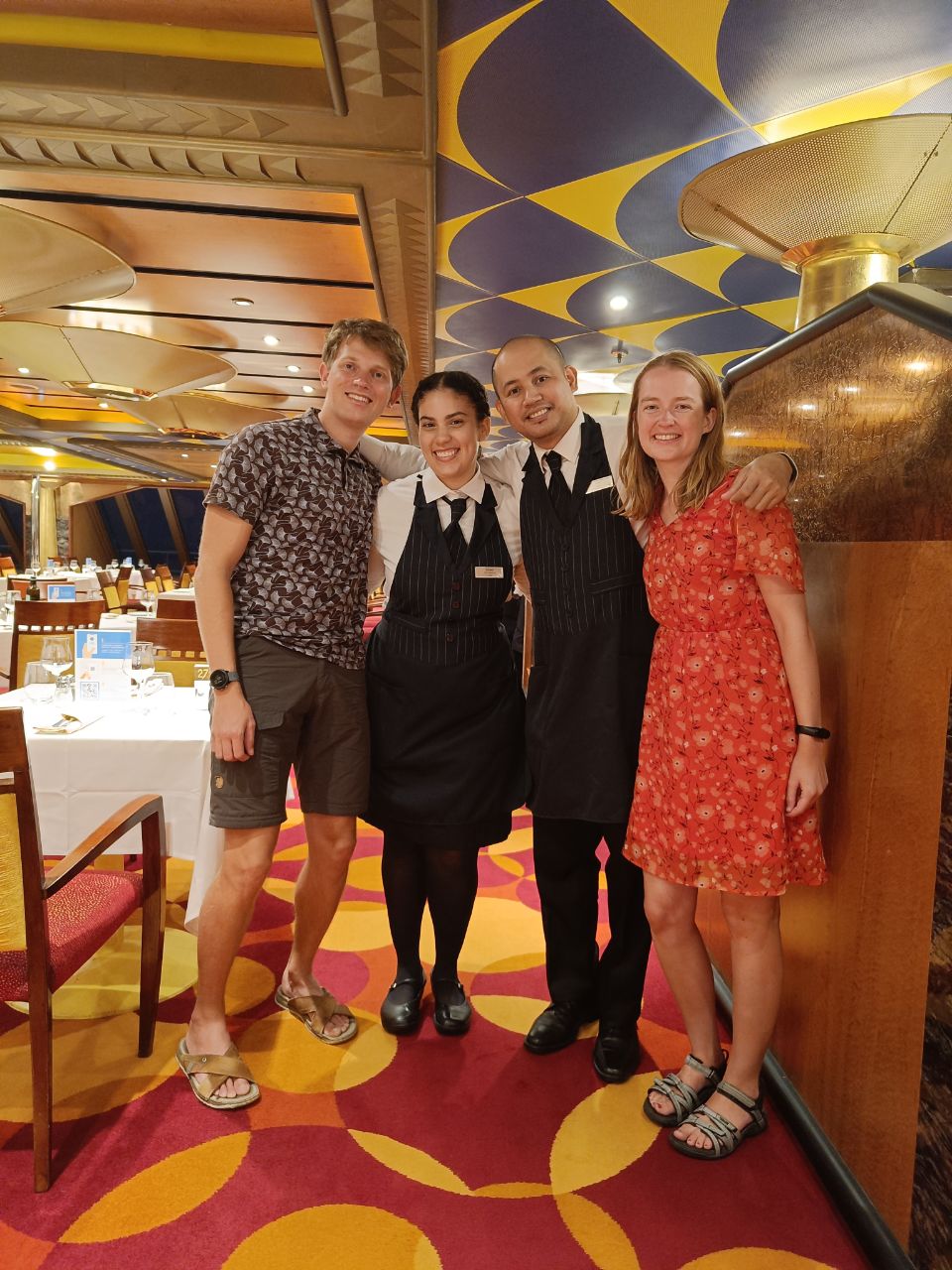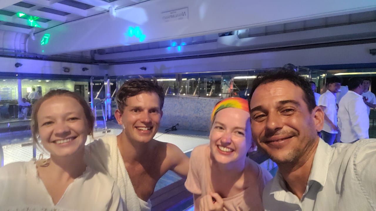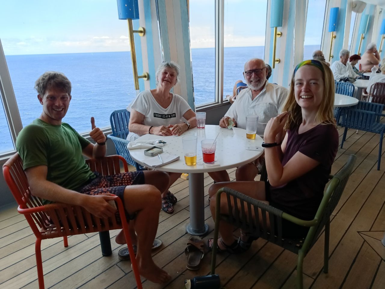 Meanwhile on sea... The last two days! Time to play the cards and go to the gym once more! But also sweet Goodbyes of the lovely staff that made our trip! Shoot out to our sportinstructor who made doing excersices (looks) like fun and the great duo in the restaurant, who served us nice and also opened theirselves for us! And we even did a dance!